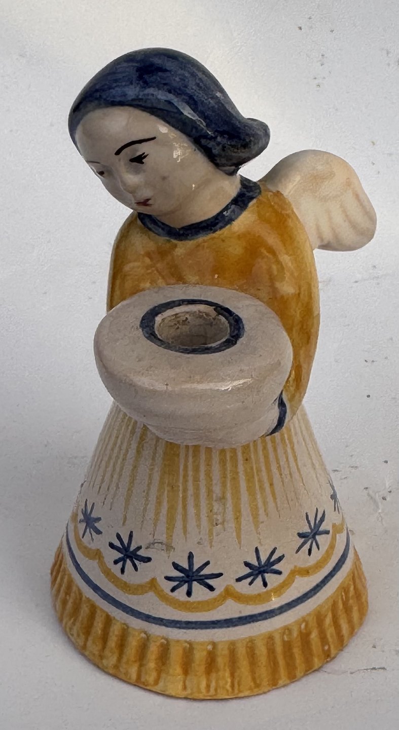 ANGEL IN A YELLOW DRESS: Figure of a painted angel in ceramic as a candle holder from the Bornholm pottery factory Lauritz Hjorth. Appears in good condition without damage or repairs. Factory mark on the bottom. H. 9.5 cm Dealer