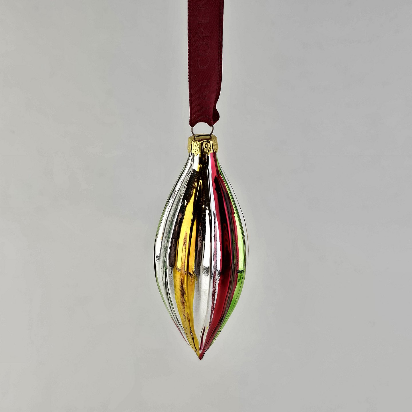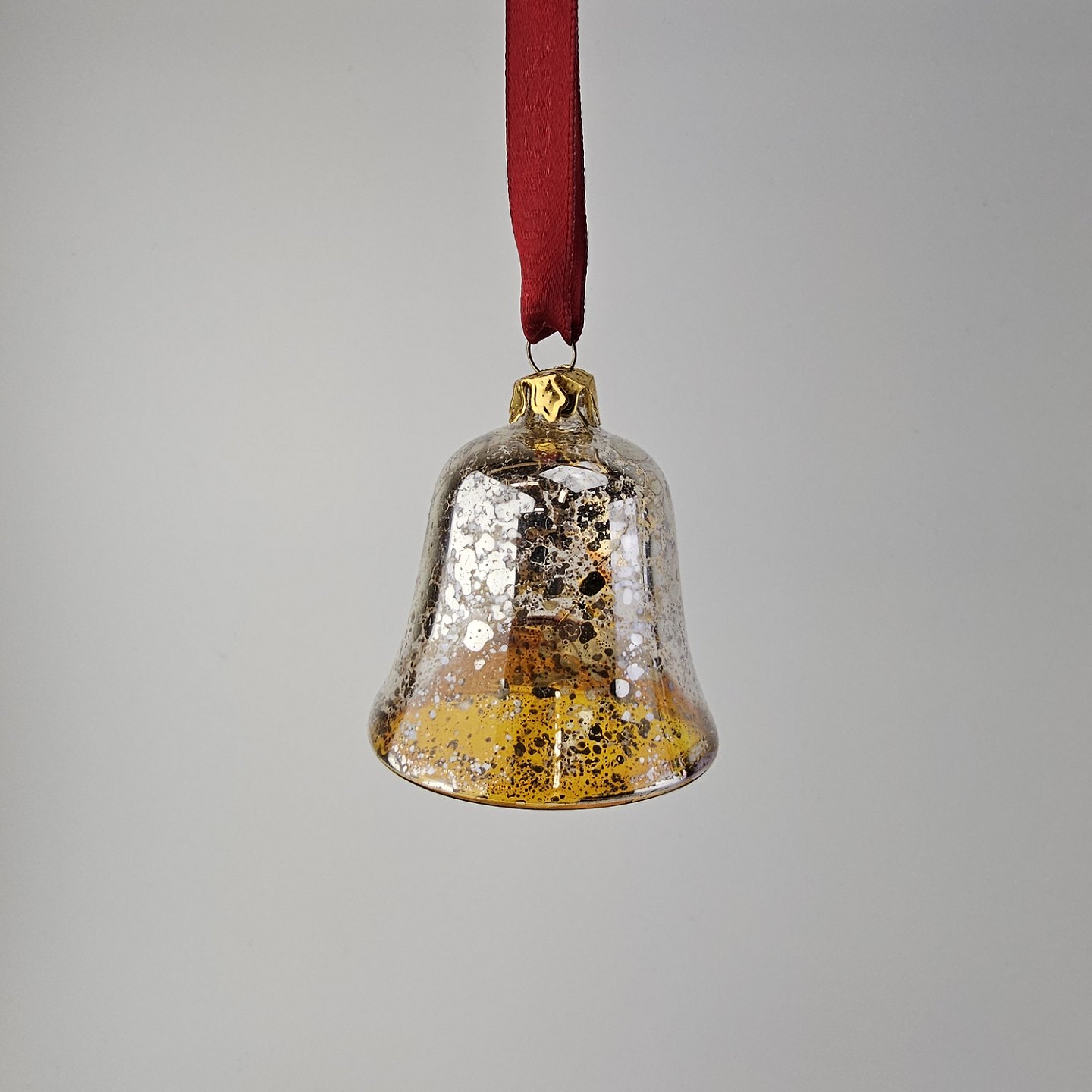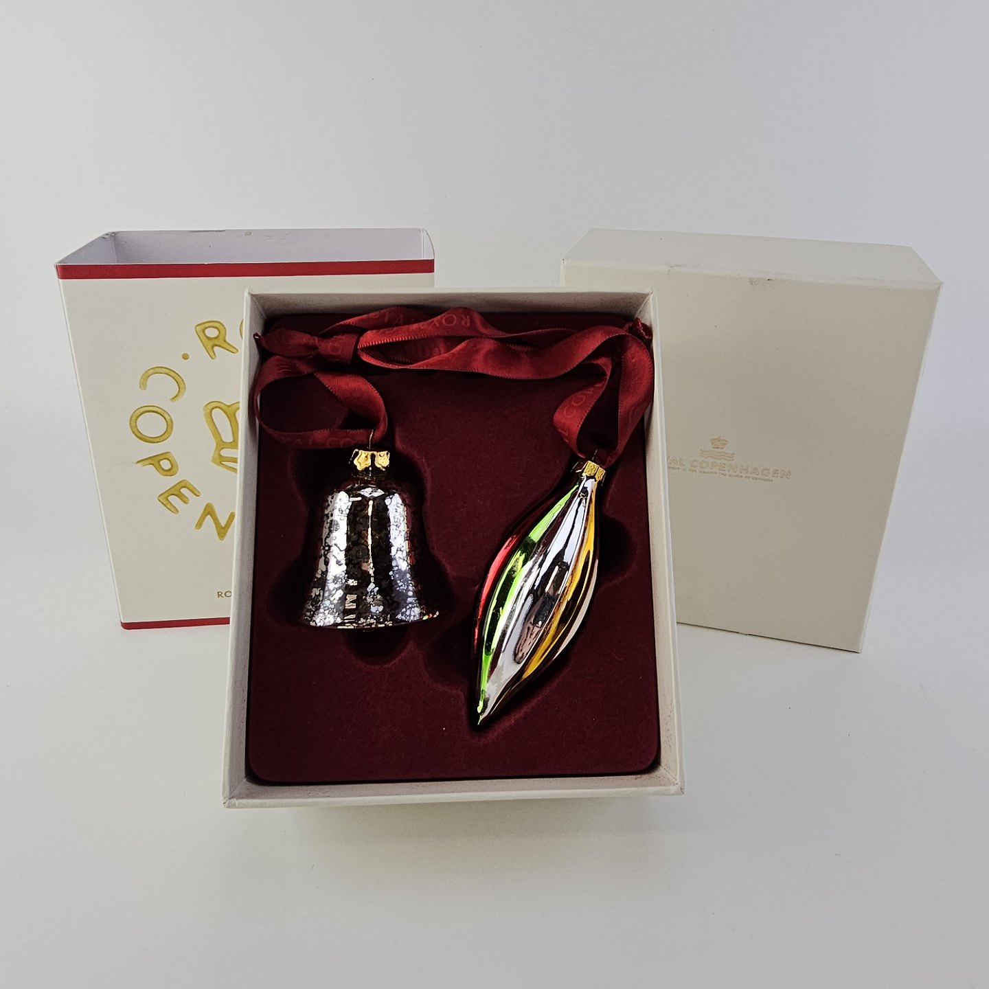 Juleornamenter i glas med motiv af en klokke og en aflang julekugle med rødt bånd til ophængI original kasse