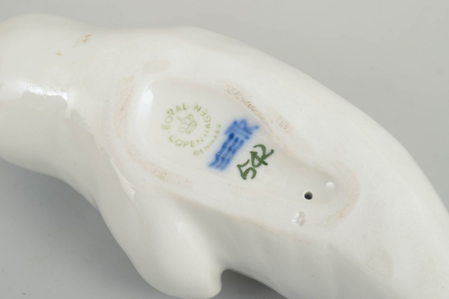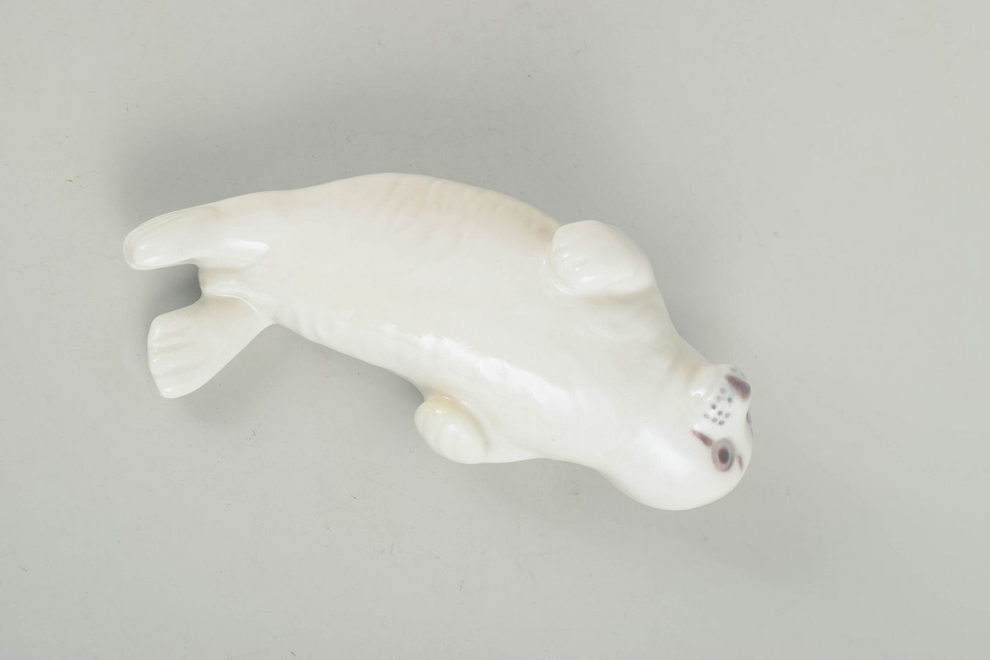 Royal Copenhagen, baby seal figurine.Porcelain figurine depicting a reclining baby seal, modelled with soft, rounded forms and finished in a uniform white glaze that emphasises the calm, naturalistic expression. Model 542.