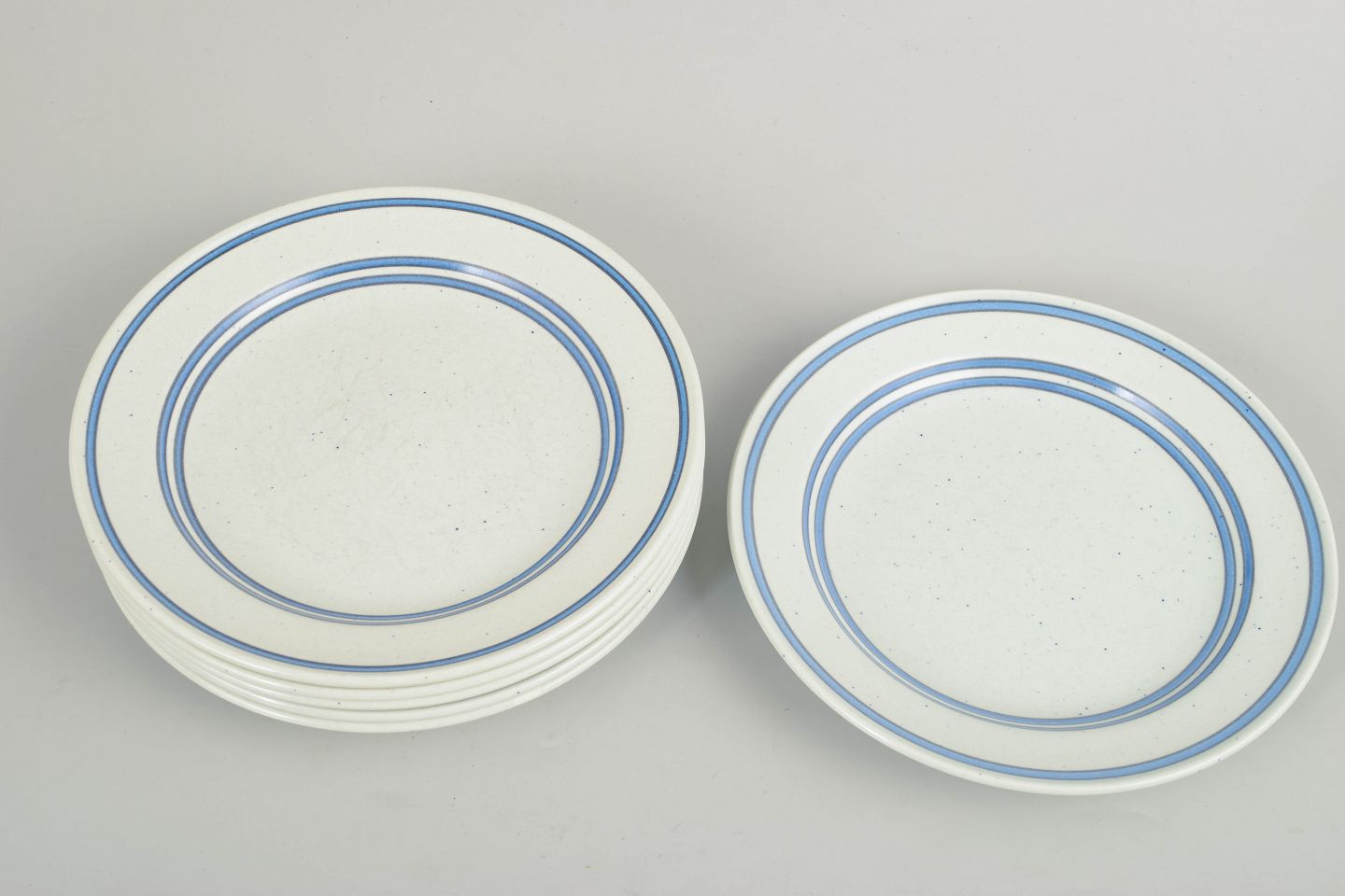 Stig Lindberg for Gustavsberg, six salad plates.Set of salad plates in faience with a simple circular form and restrained blue line decoration on a light ground. The plates are produced as part of Gustavsberg’s “Dart” series, characterised by its clean and graphic expression, typical of Stig Lindberg’s work from this period.