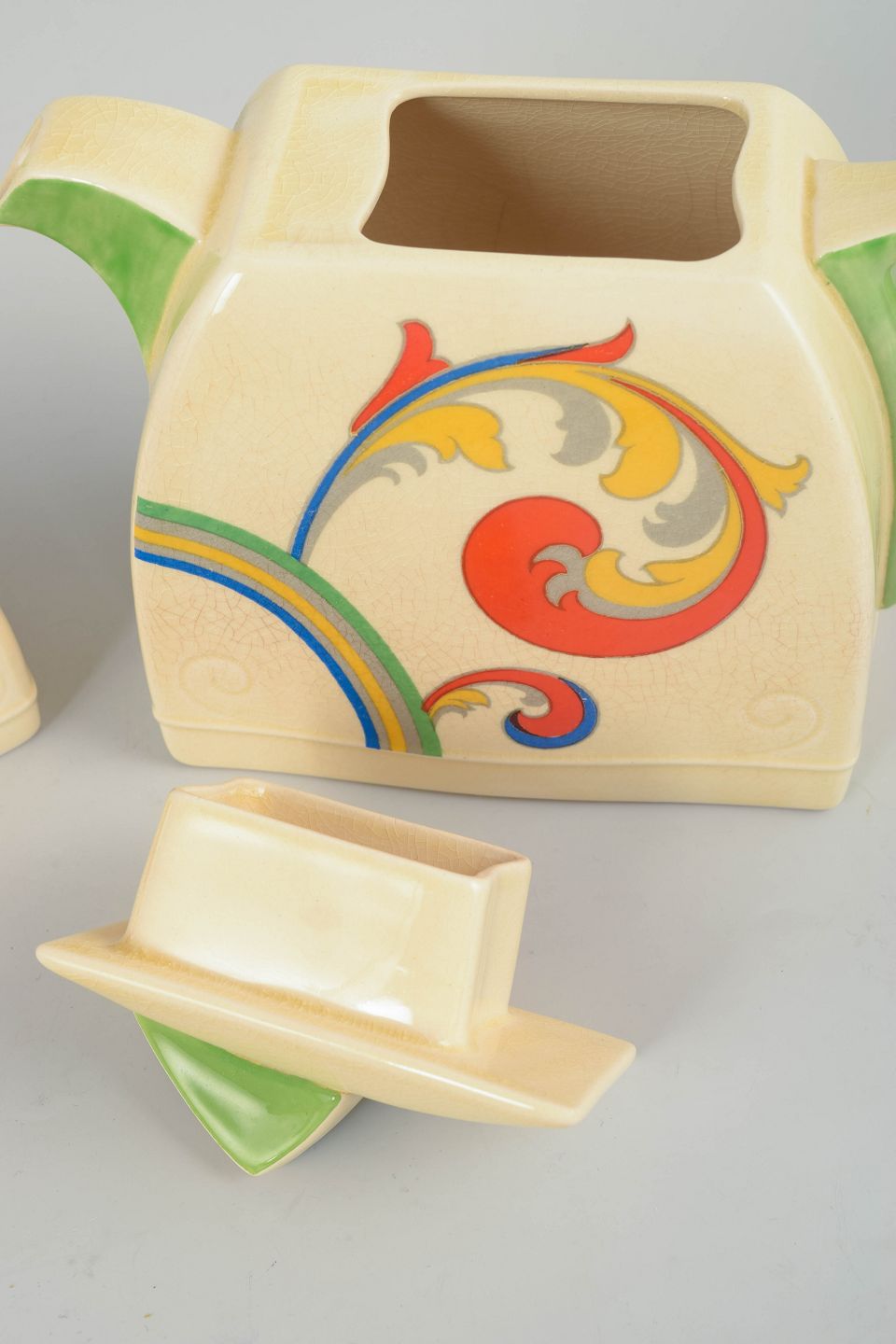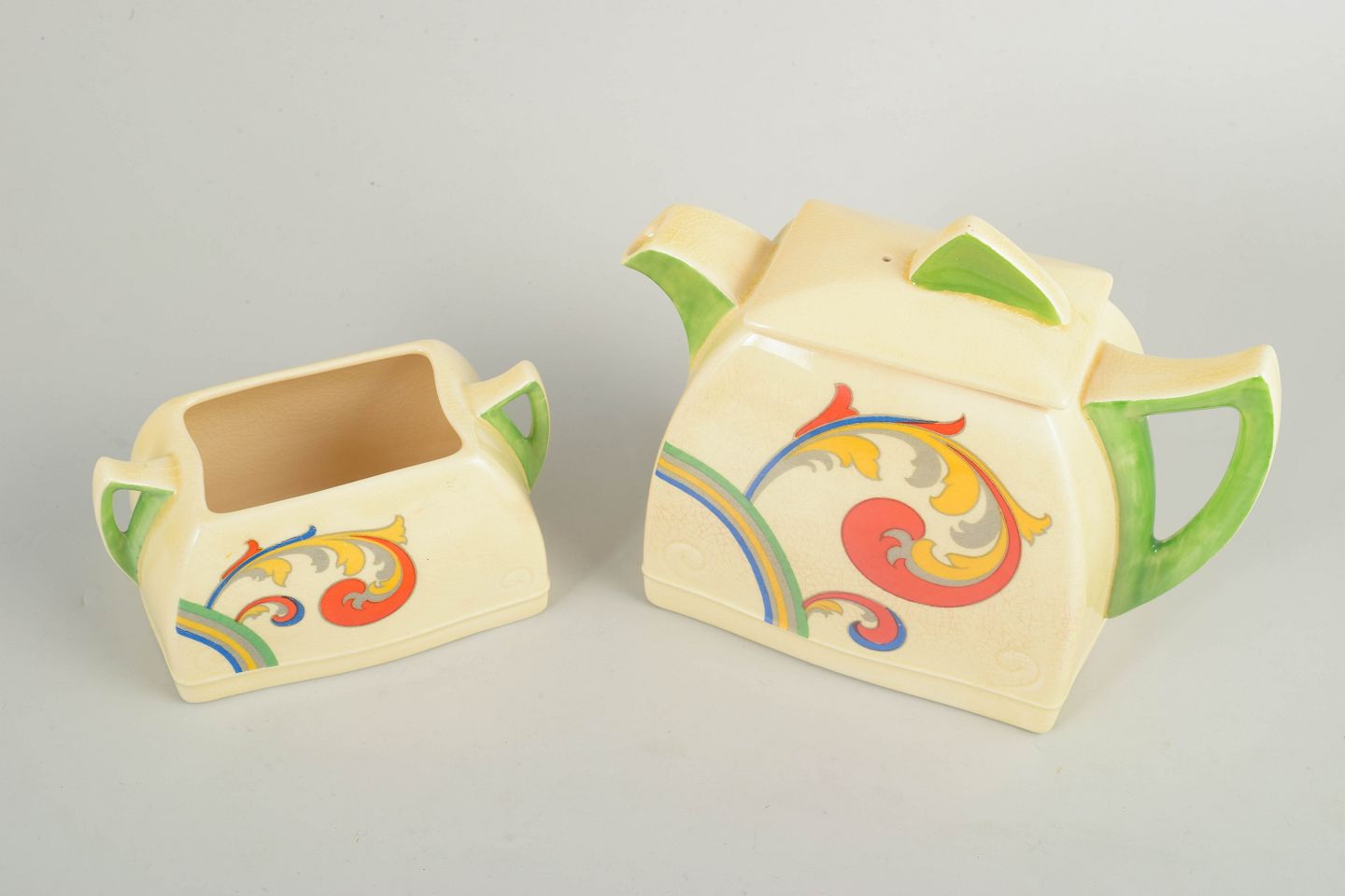 Clarice Cliff for Royal Doulton, teapot and sugar bowl.Art Deco faience teapot and sugar bowl with hand-painted decoration from the “Syren” series. Both pieces feature distinctive angular forms with green handles and lid details, combined with a dynamic, stylised floral motif in vivid colours characteristic of Clarice Cliff’s design language.
