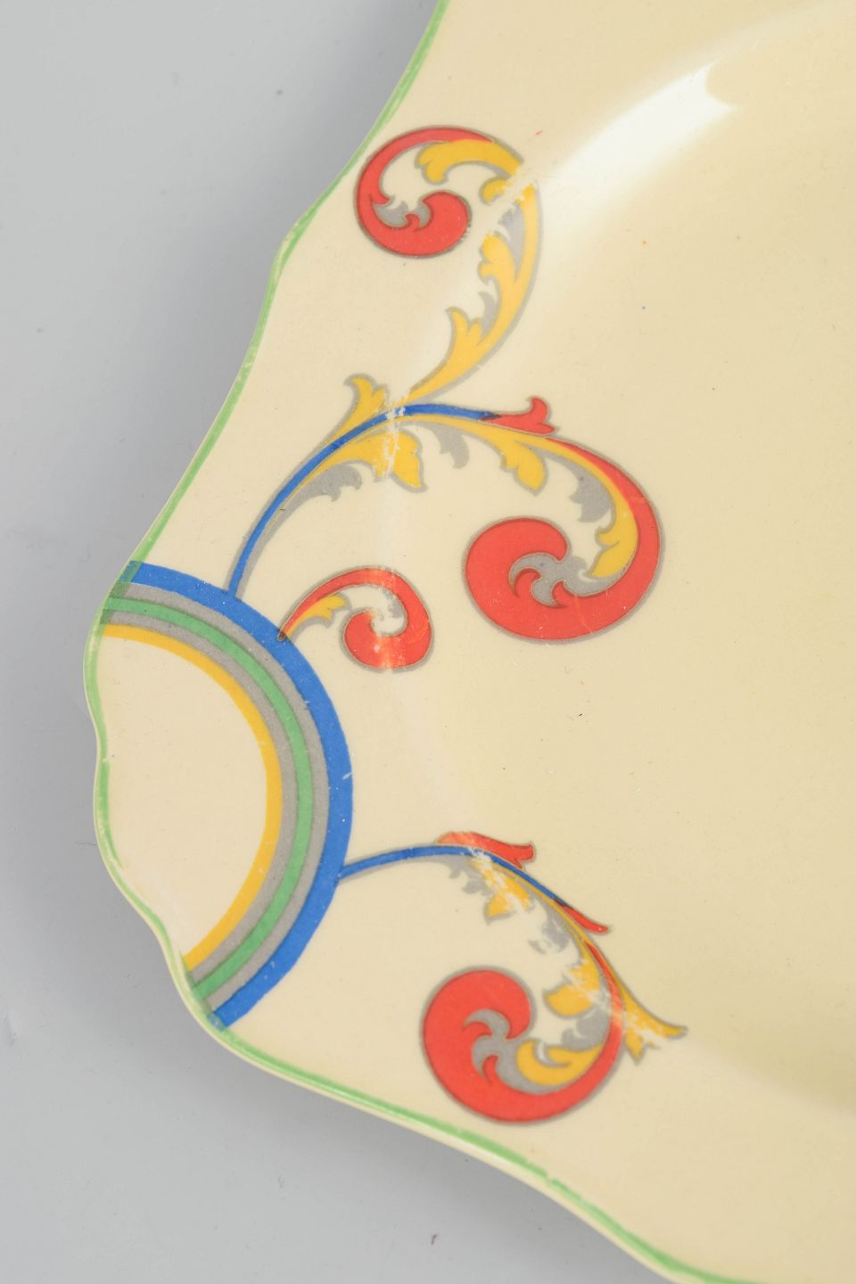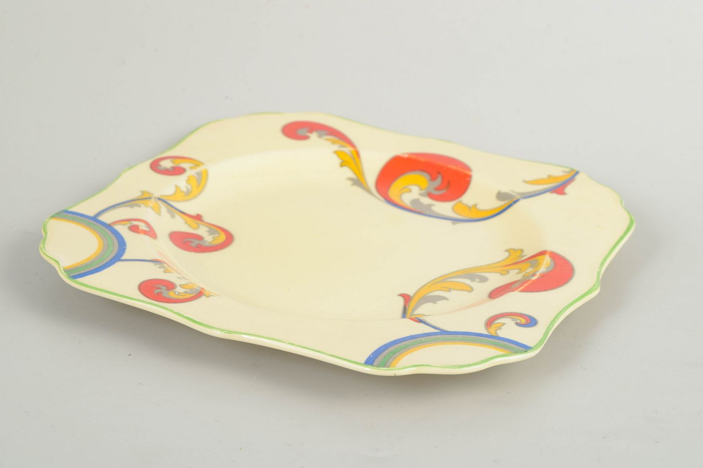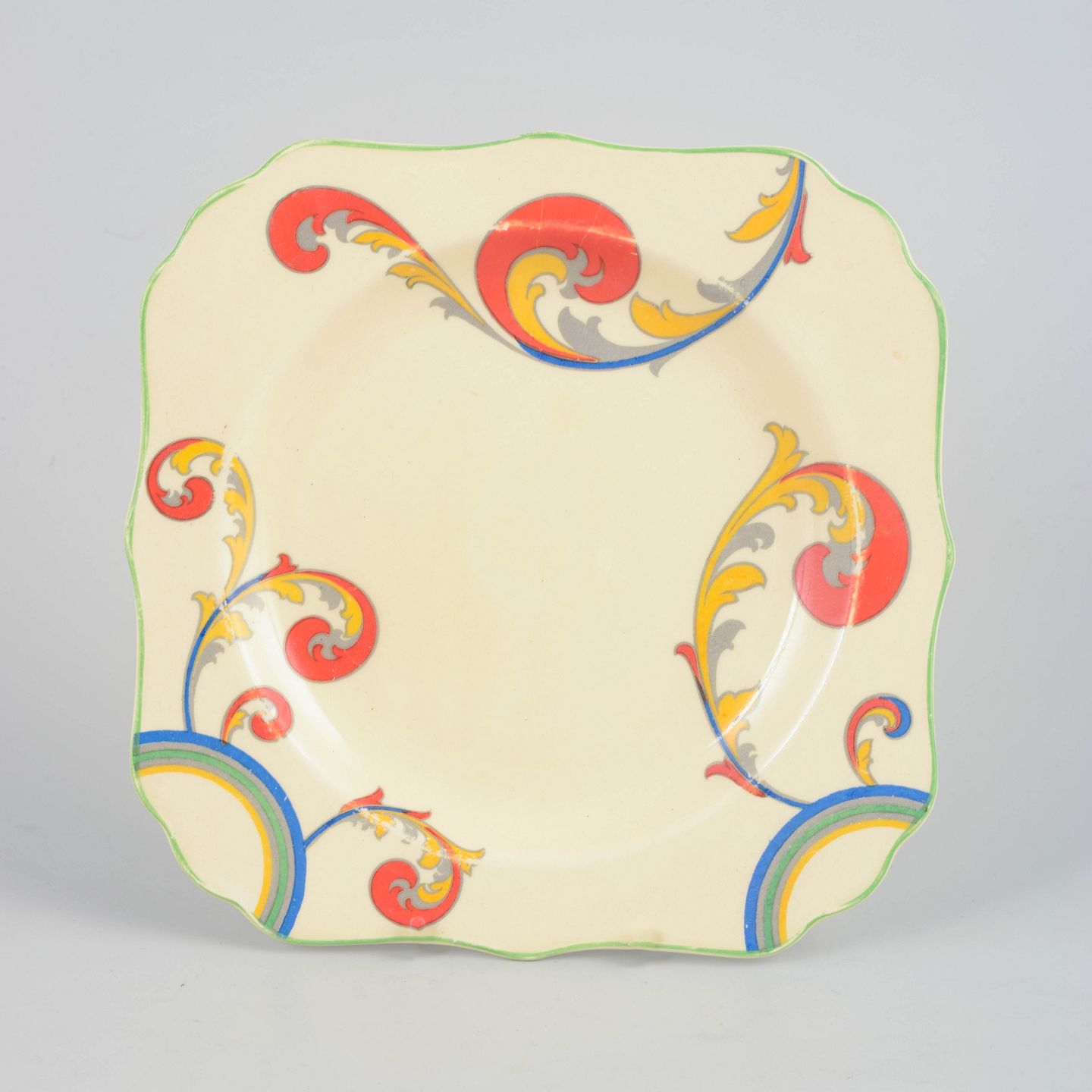 Clarice Cliff for Royal Doulton, dish.Art Deco faience dish with hand-painted decoration from the “Syren” series. The dish features a softly square form with a gently scalloped edge and a vivid, stylised floral motif in bold, contrasting colours, characteristic of Clarice Cliff’s decorative language.