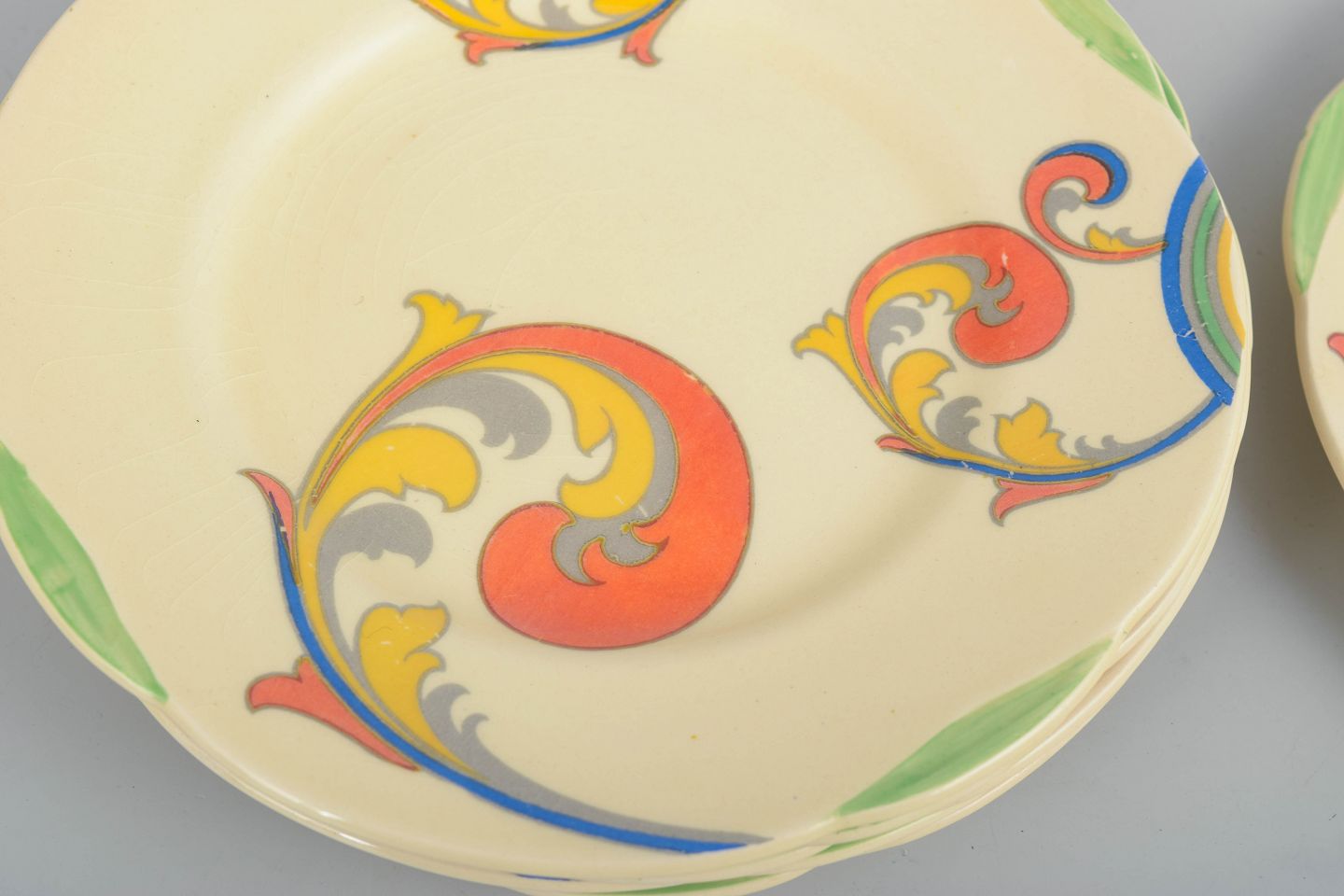 Clarice Cliff for Royal Doulton, set of 6 cake plates.Art Deco faience cake plates with colourful hand-painted decoration from the “Syren” series. The plates feature a round shape with a gentle rim and a vivid, stylised floral motif in bright, period-typical colours, characteristic of Clarice Cliff’s interwar production.