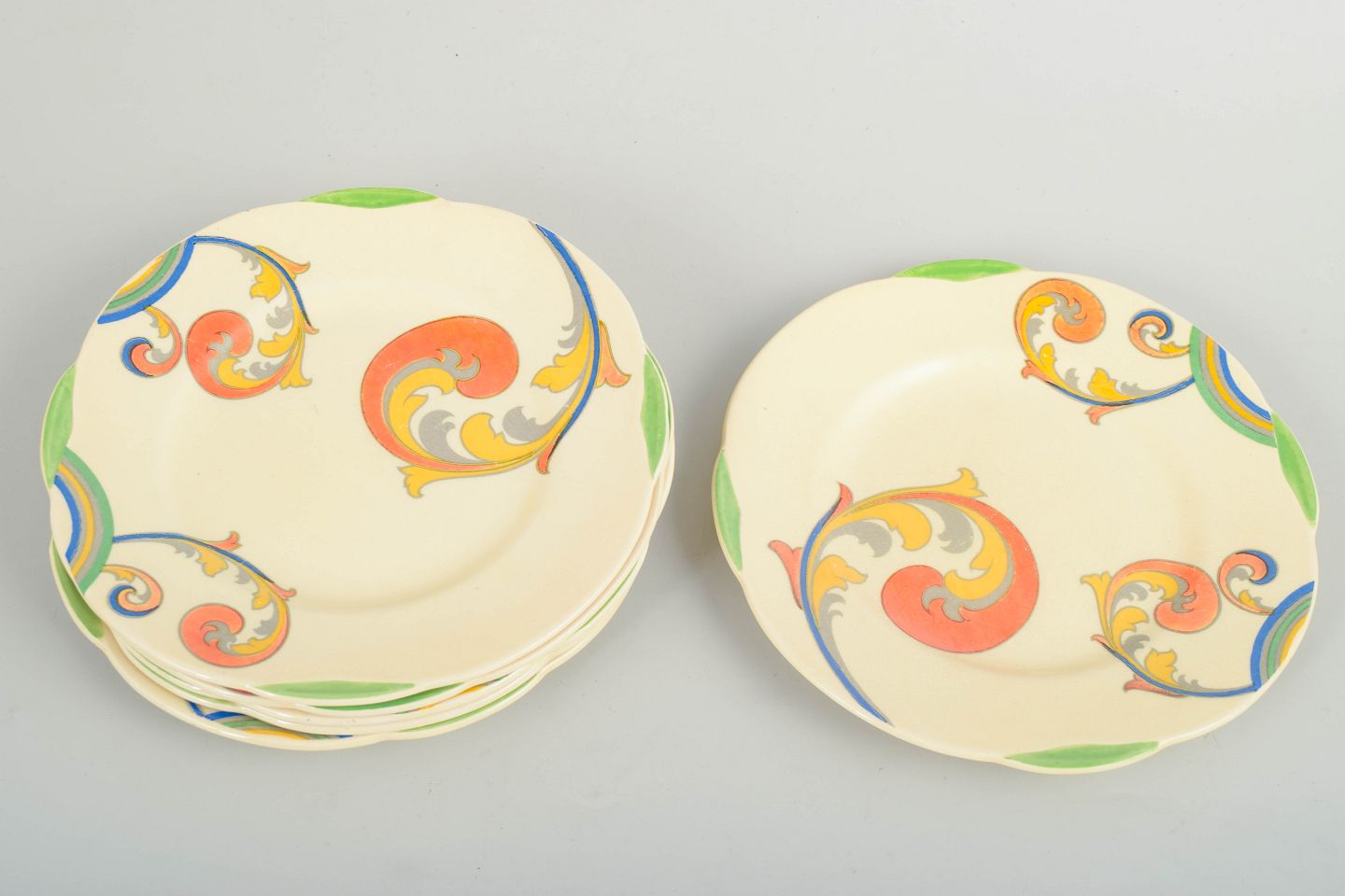 Clarice Cliff for Royal Doulton, set of 6 cake plates.Art Deco faience cake plates with colourful hand-painted decoration from the “Syren” series. The plates feature a round shape with a gentle rim and a vivid, stylised floral motif in bright, period-typical colours, characteristic of Clarice Cliff’s interwar production.