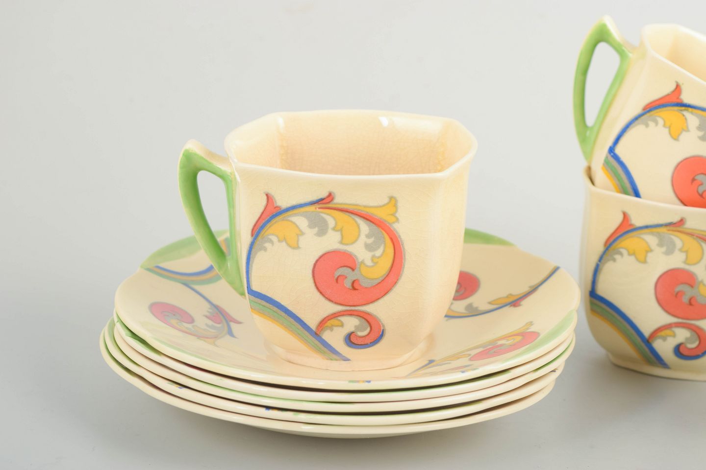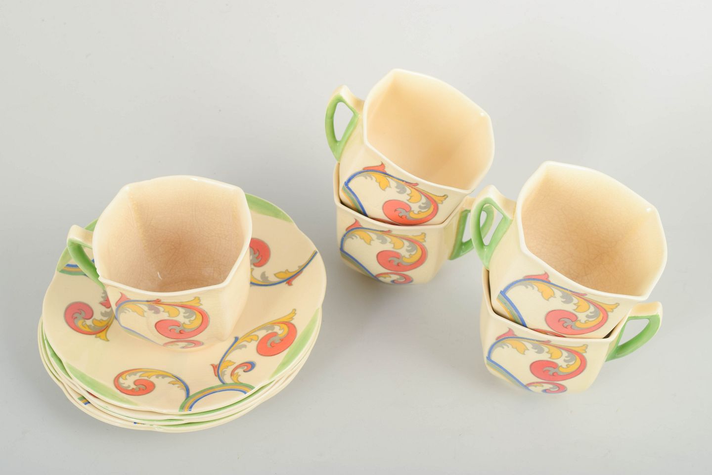 Clarice Cliff for Royal Doulton, set of 5 coffee cups with saucers.Art Deco faience coffee set with a craquelure glaze and decoration from the “Syren” series. The cups have a classic, subtly conical profile, paired with round saucers that emphasise the period character and the decorative surface.