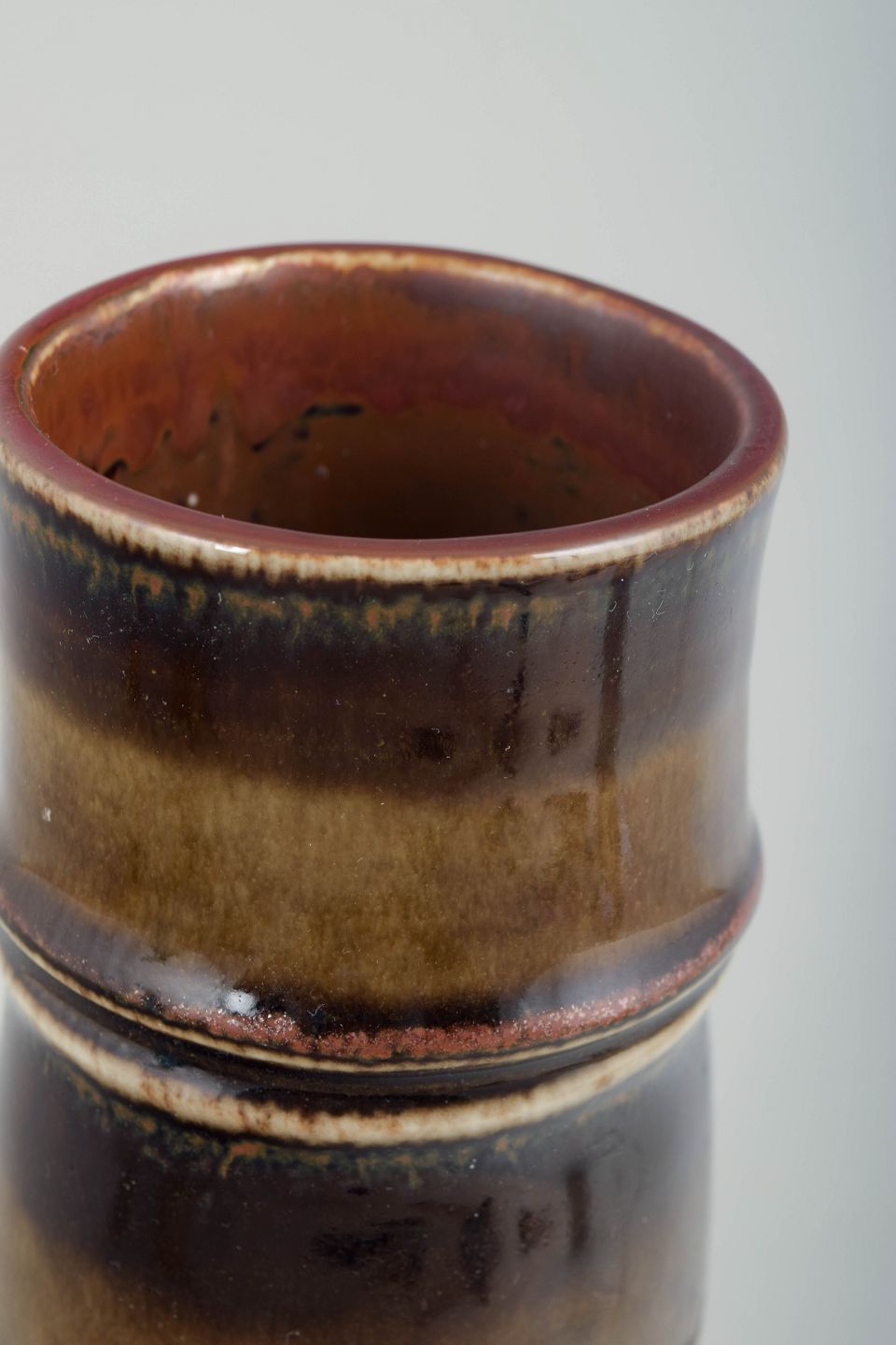 Olle Alberius for Rörstrand, vase.Tall, cylindrical stoneware vase with a pronounced vertical structure and subtly profiled rings. The surface is covered with expressive, flowing glazes in warm brown, amber, and beige tones, creating depth and variation typical of Rörstrand’s artistic stoneware production of the 1970s.