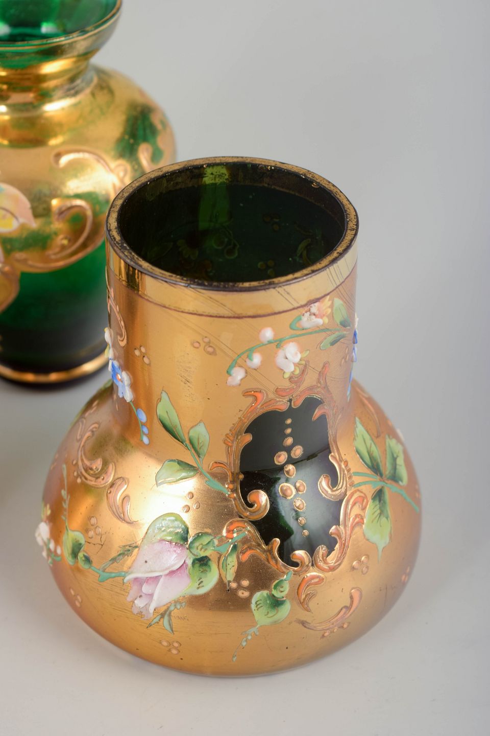 Bohemian glass, set of four pieces.Decorative set comprising four pieces in green glass with rich gilt decoration and enamel-painted floral motifs. The set includes a small pitcher, a bell-shaped piece with finial, and two vases in varied forms. Hand made in Bohemia, showing clear variation in shape and proportions.