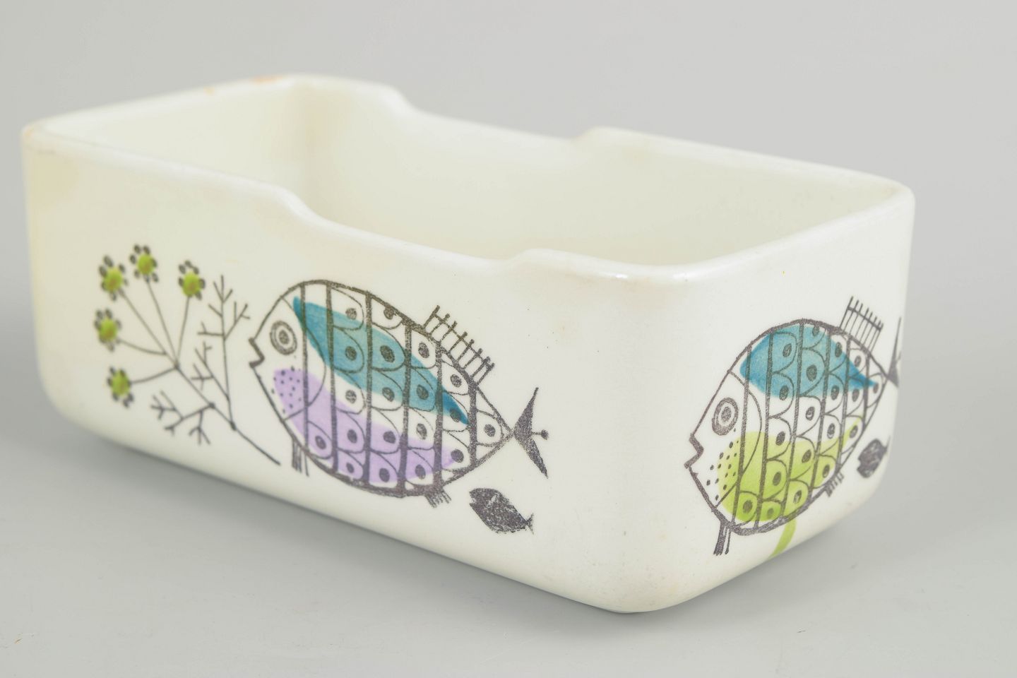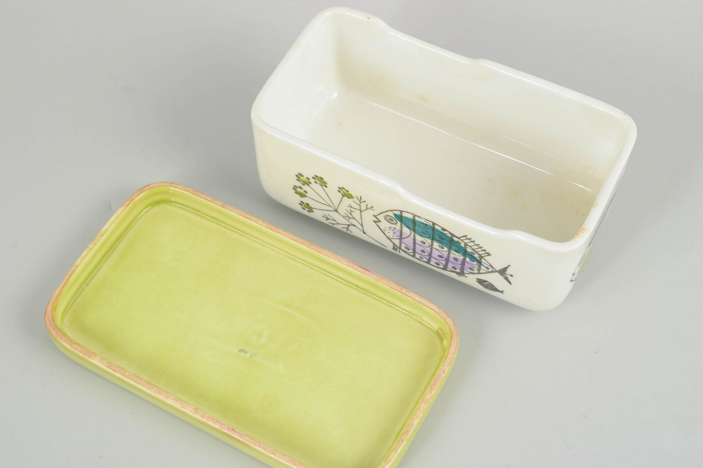 Rare rectangular faience butter jar with original light green glazed lid. Decorated with stylised fish and plant motifs in turquoise, lilac and green – a playful and iconic design from Rörstrand’s “Petri” series.