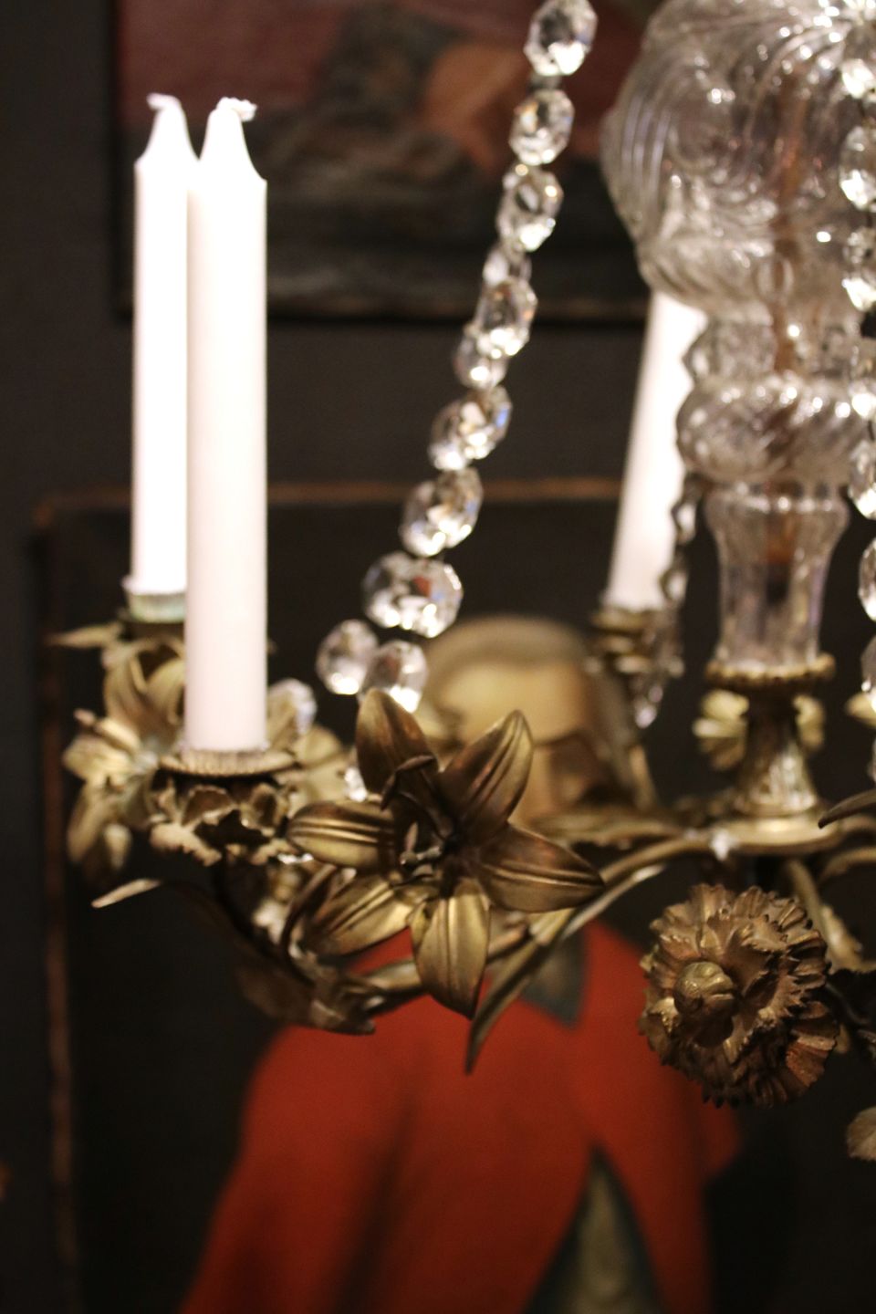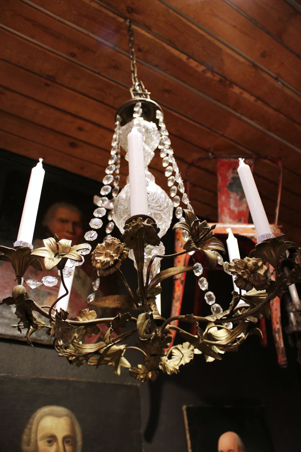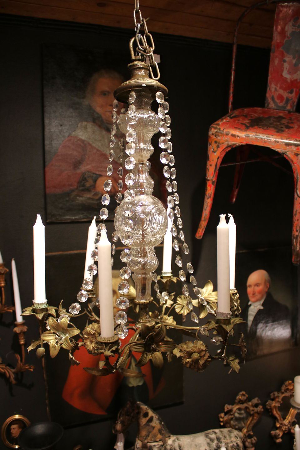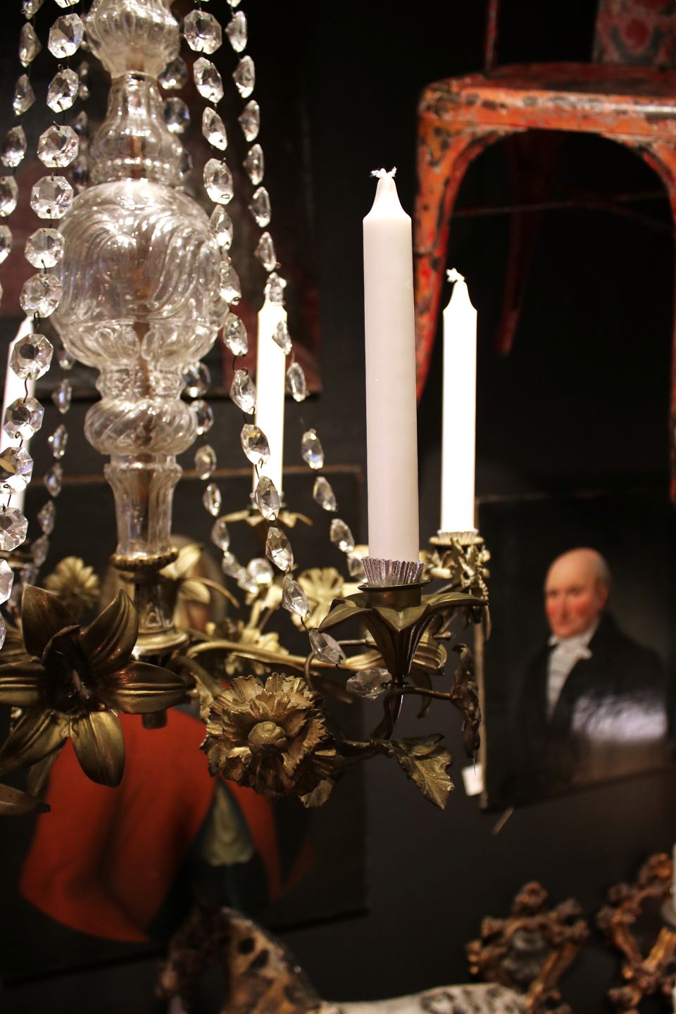 We offer a wide selection of old furniture with character, prism chandeliers and French church candlesticks.