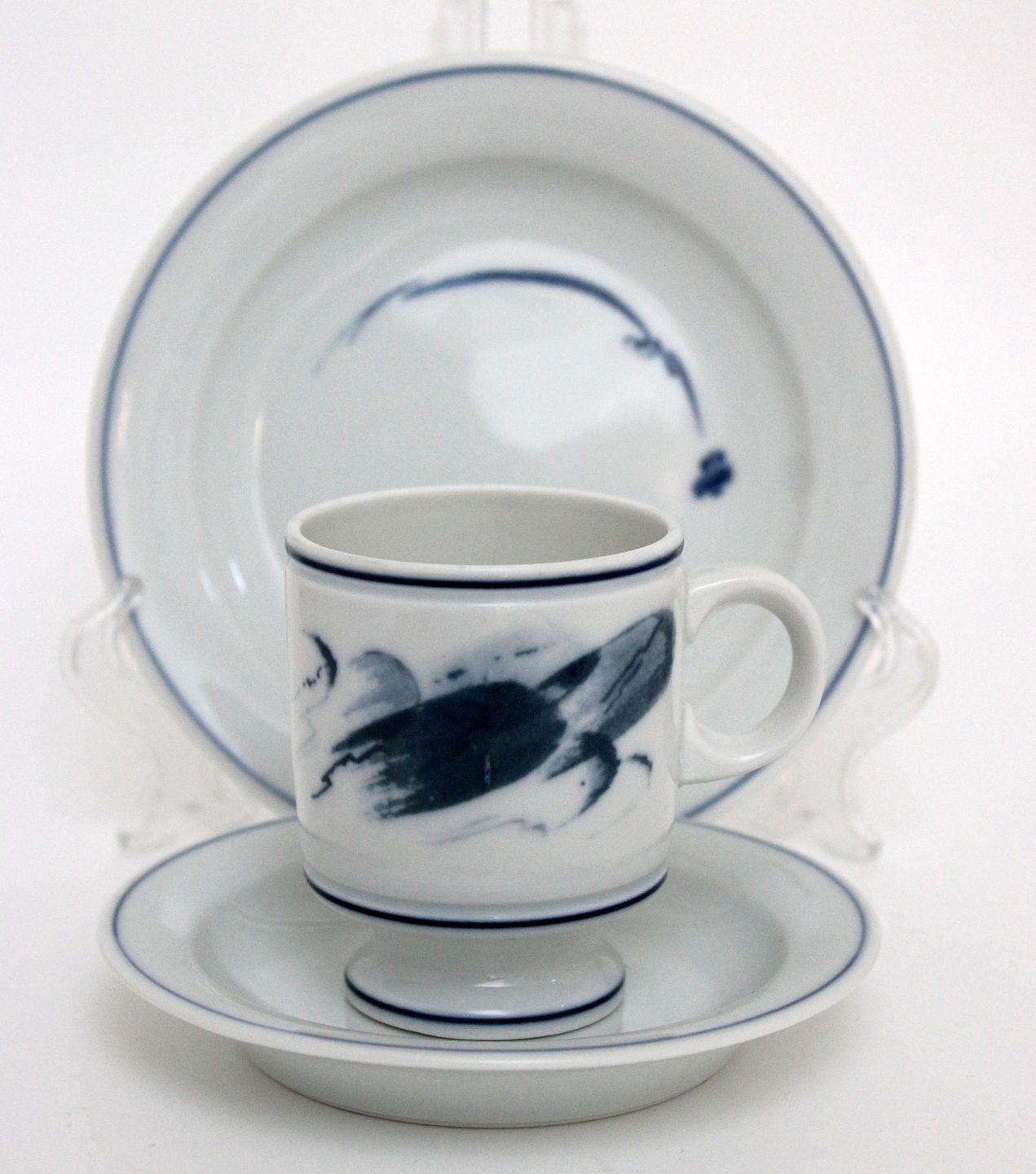 Bing & Grøndahl, Cumulus, Kaffekop og kagetallerken. Designet af Martin Hunt og dekoret af Carl-Harry Stålhane. Produceret fra starten af 1970'erne og 1983. Kop på fod. Nr. 305. Højde 8 cm. Diameter 6,5 cm. Underkop. Diameter 13 cm. Kagetallerken. Nr. 306. Diameter 16 cm.Pris pr sæt på 3 dele: 175 kr. Lager: 3 sæt.