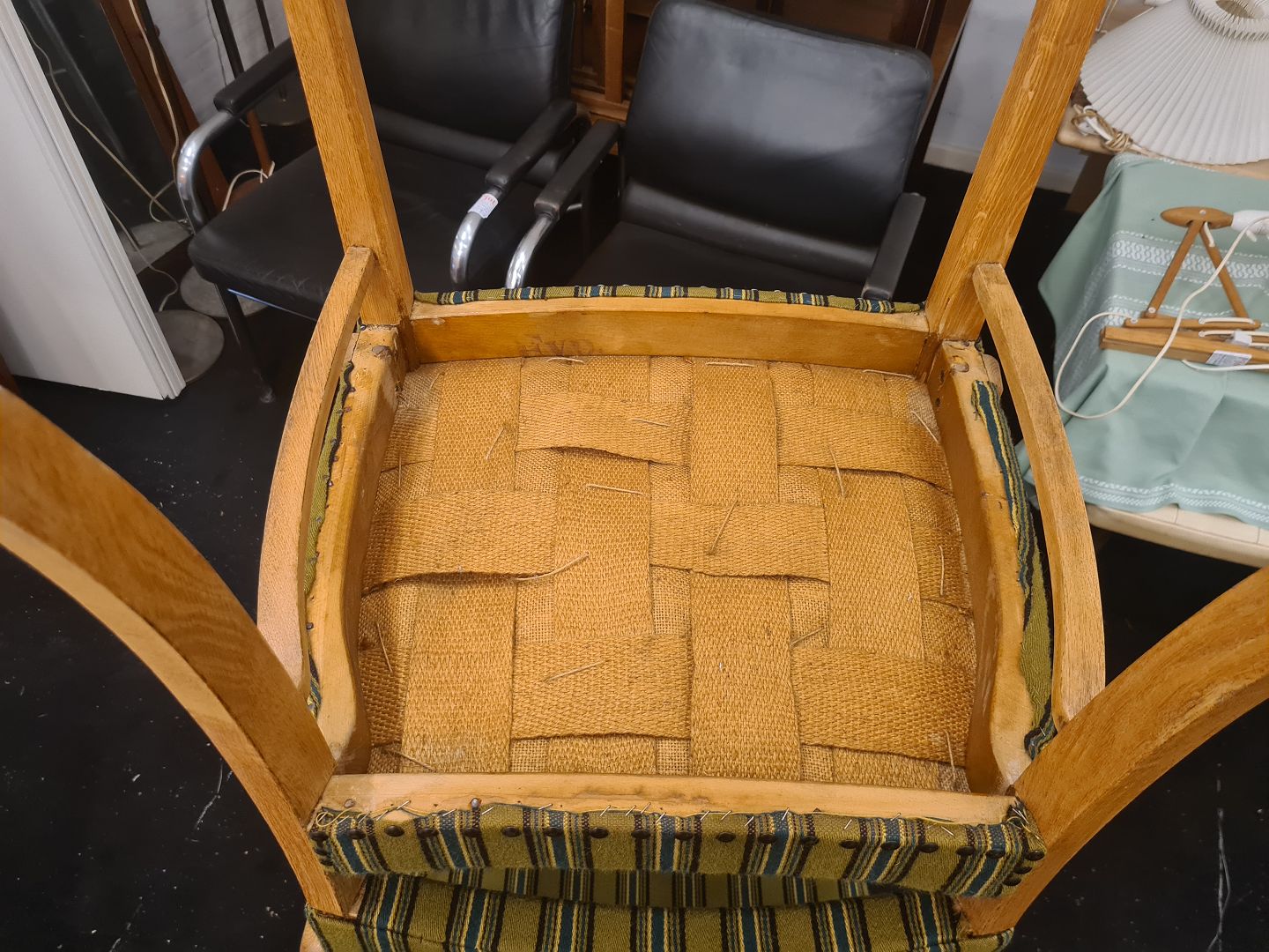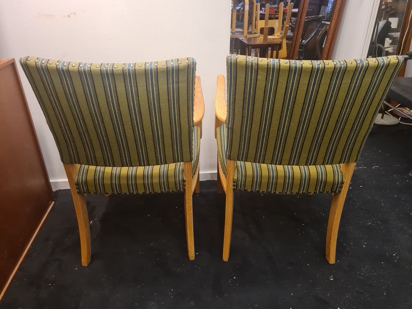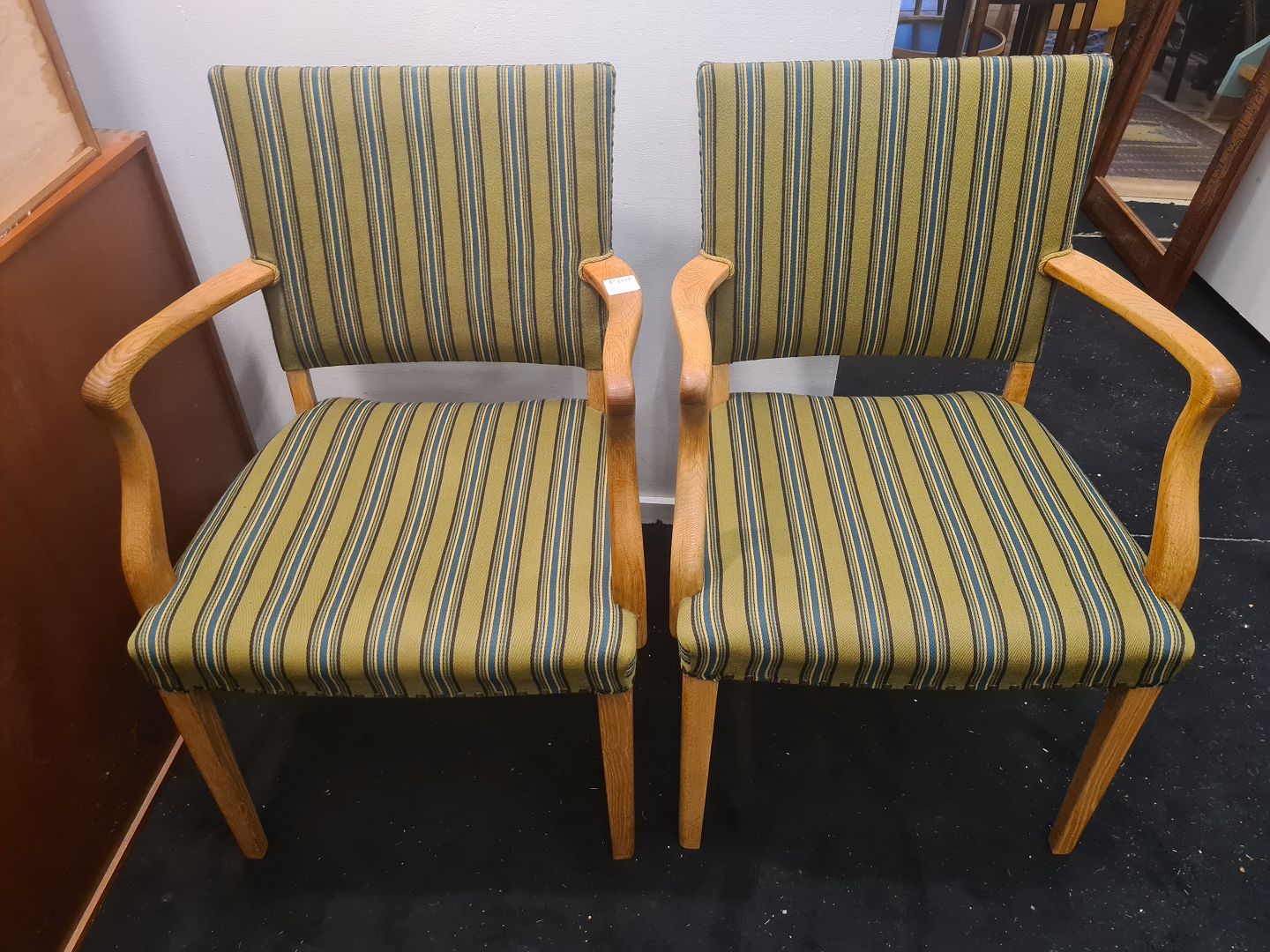 Par Dansk Design armstole fra 1950'erne. Fremstillet i eg og betrukket med stof fra 1970'erne. Fremstår gode og stabile uden nævneværdige brugsspor. Højde 85 cm. Bredde 54 cm. Dybde 60 cm.