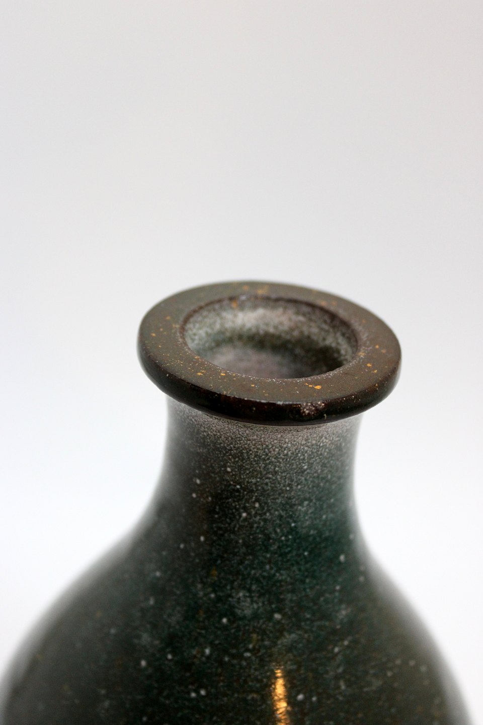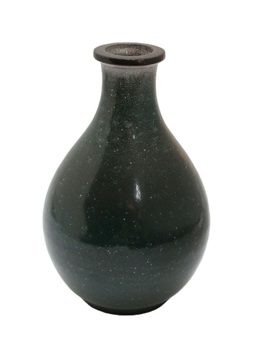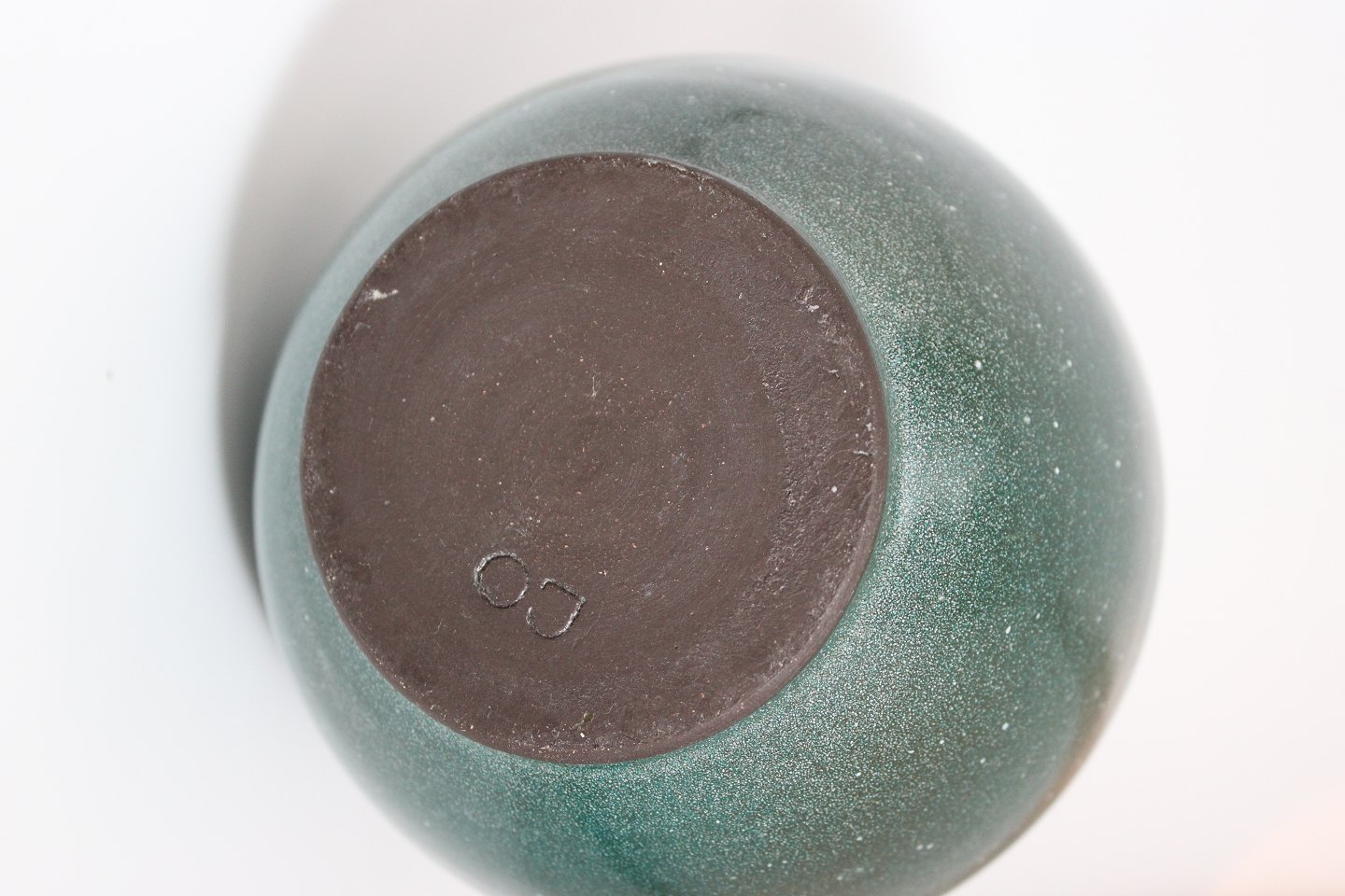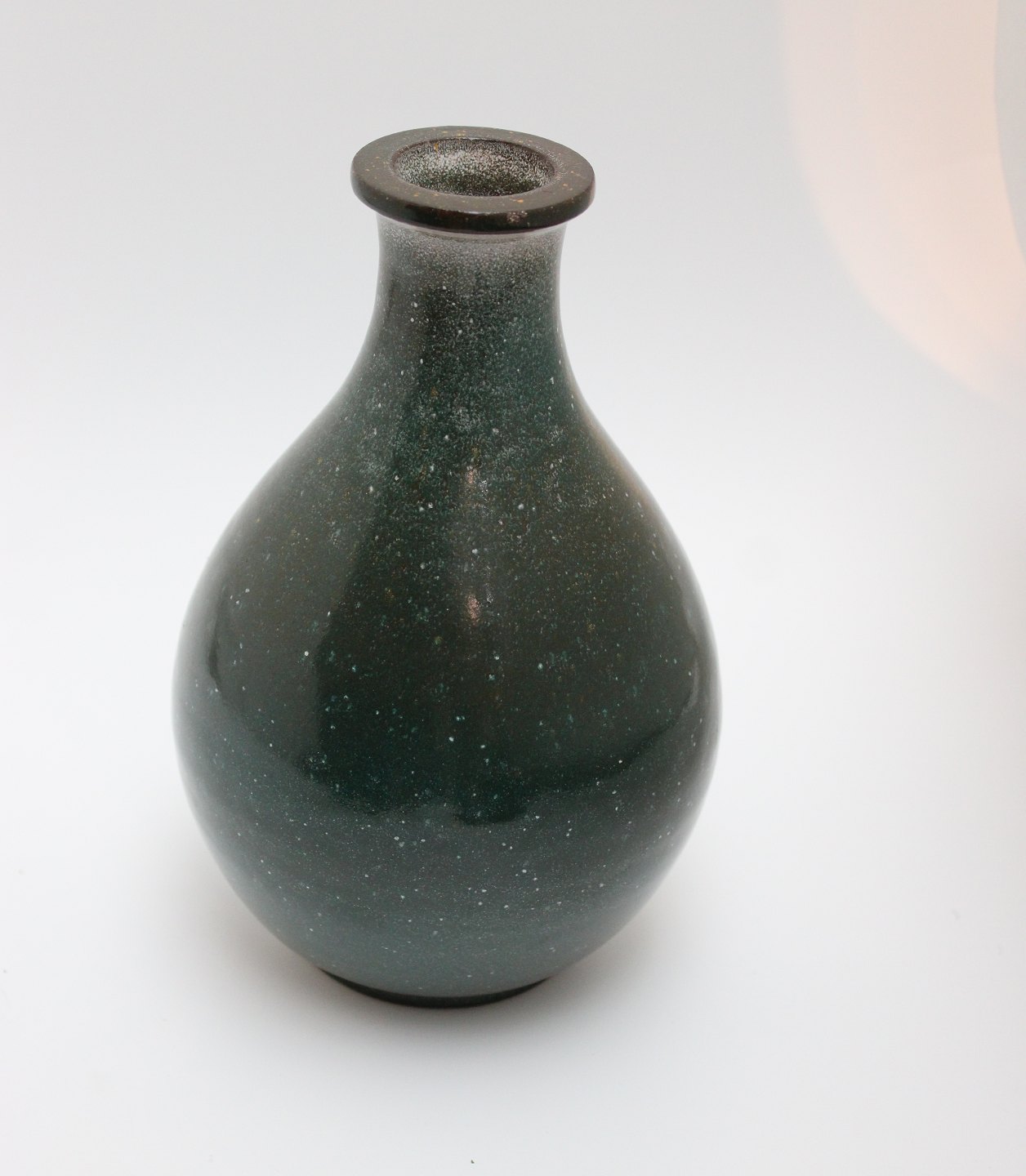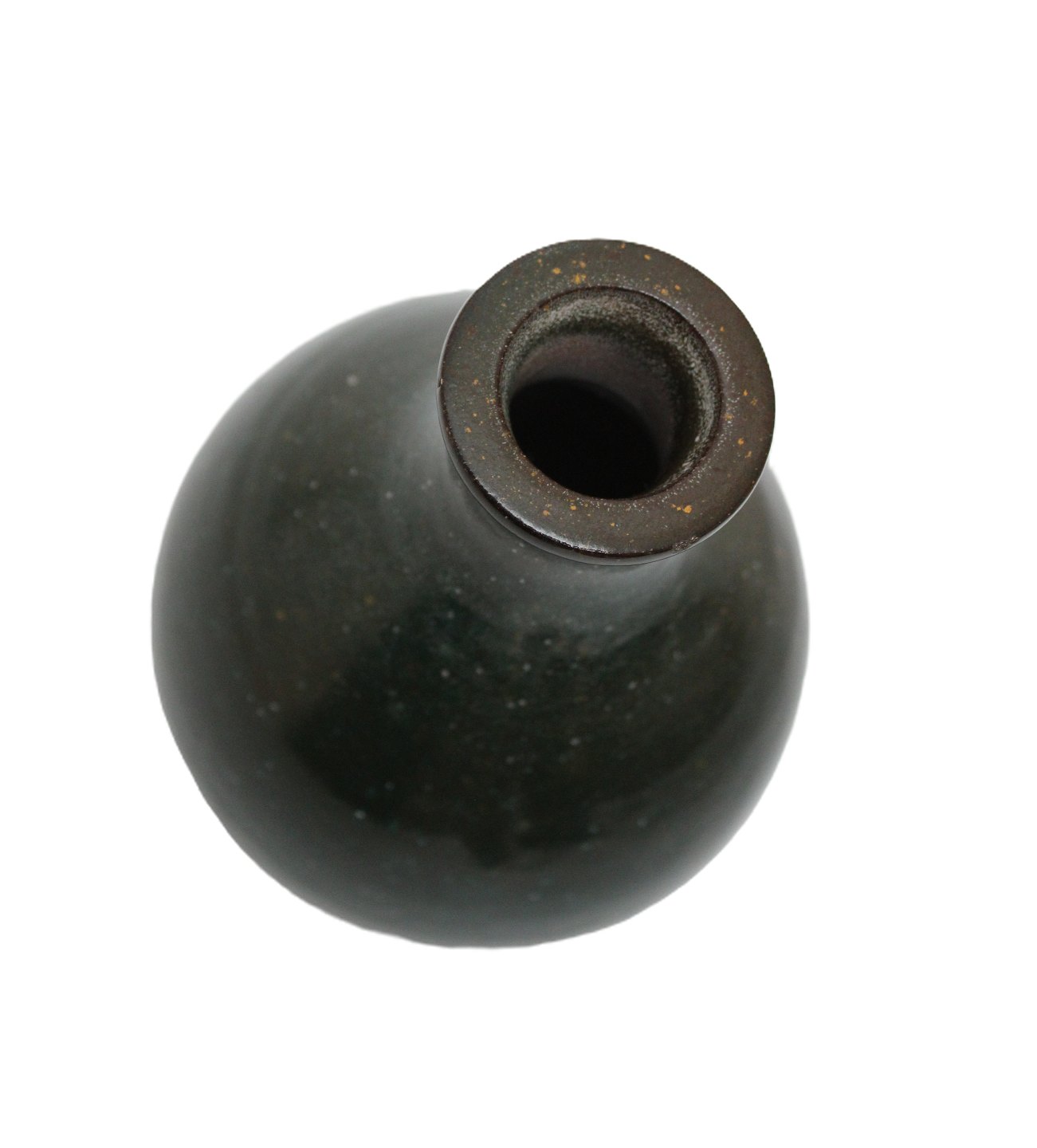 Grøn Vase af Orla Jespersen eget værksted, uddannet hos Kähler. 1948 selvstændigt keramikværksted. Flyttede til Odsherred i 1980'erne.Smuk vase i grønnistret glasur med brun kant. Der er et lille glasur afslag i kanten. Signatur OJ. Højde 19 cm. Største diameter 12 cm. Pris: 350 kr.