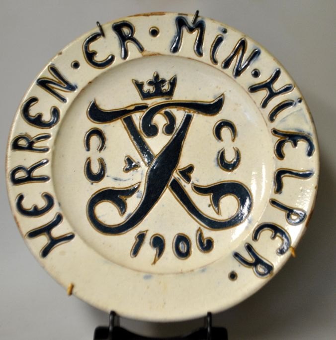 Danish ceramist (1906): Commemorative plaque for the accession of King Frederik VIII to the throne, 1906. With blue and white clock face. With King Frederik VIII's monogram and motto: The Lord is my helper. Diameter: 28 cm.Item number: 28765