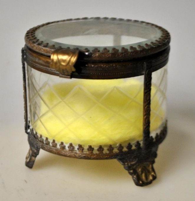 Jewelry box, France, circa 1900. With faceted glass and decorated brass frame and three legs. H.: 8 cm. Dia.: 8 cm.Item number: 28770