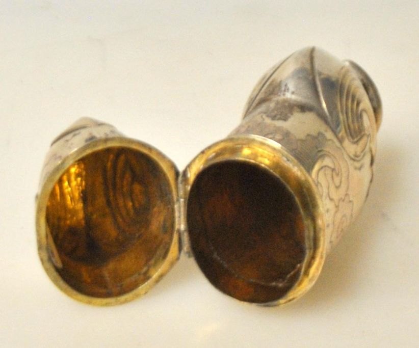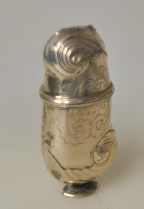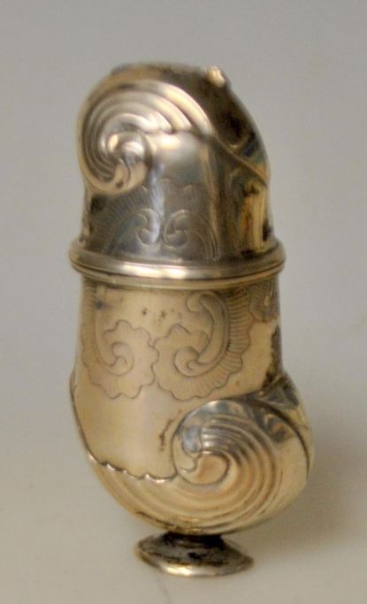 Rococo vinagrette egg in silver, 18th century. Denmark. With external rococo decorations. Internally gilded. Unmarked. H.: 7.5 cm. On a newer oval foot.NB: Part of the comb is missing. Rare shape.