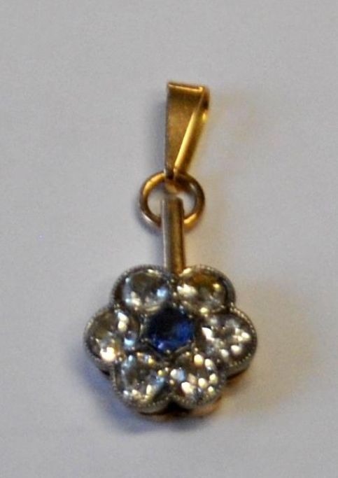 14 carat gold pendant with 6 old diamonds and a sapphire, 19th century. Mounted as a flower. Diamonds with old cut. Total 6/8 carats. H.: 2.7 cm. Dia. pendant: 1.3 cm.Item number: 28789