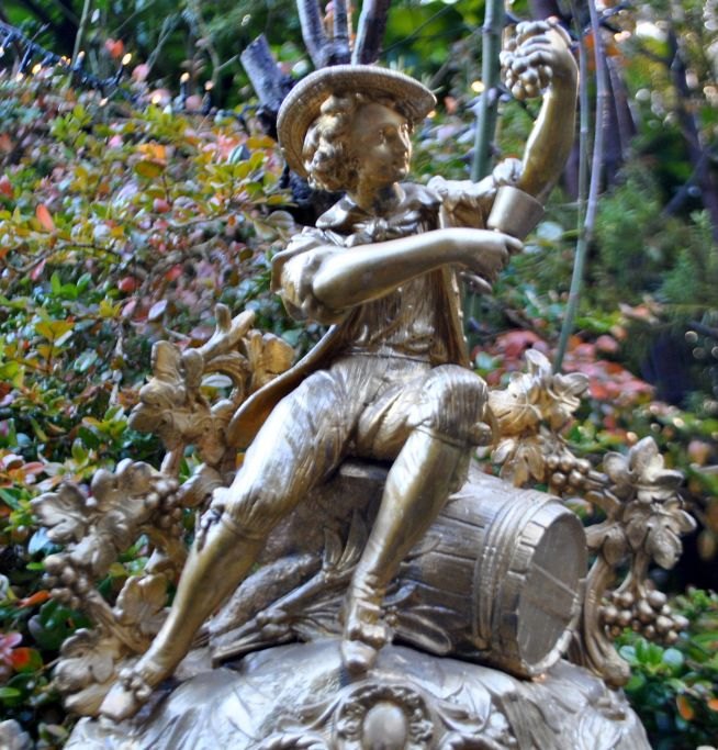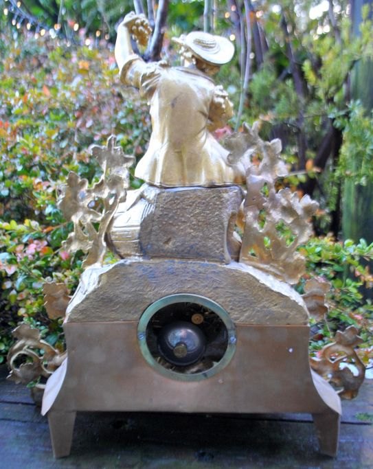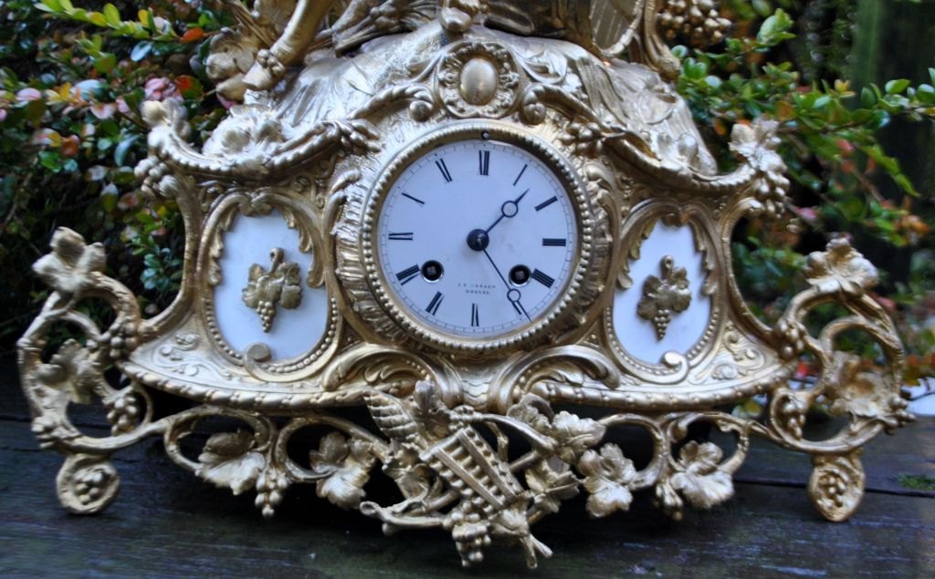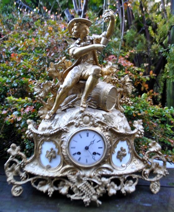 Bronzed zinc clock, c. 1870, France. Main figure of a young man sitting on top of a barrel with a mug. The entire clock is decorated with vine leaves and grapes. White enamel dial with Roman numerals. Dial signed: J. A, Hansen, Odense. H. 45 cm. W.: 42 cm. D.: 12 cm.Key and pendulum included.