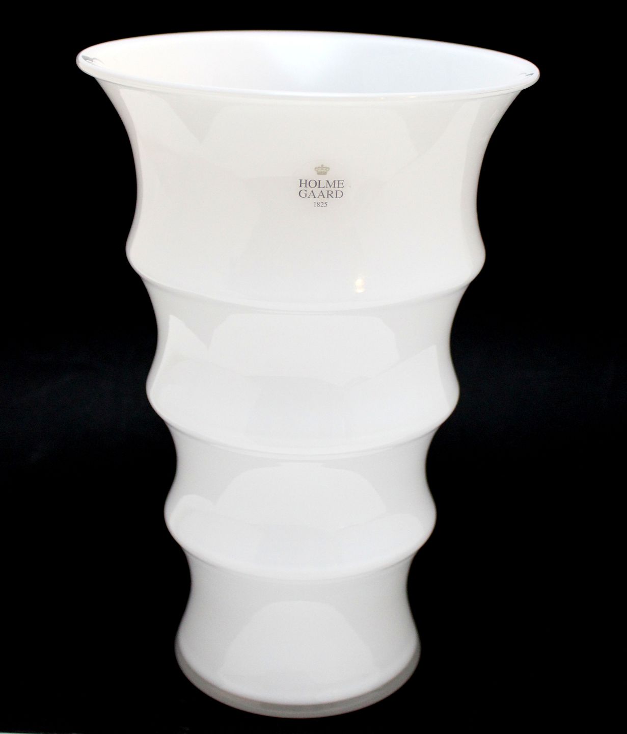 Holmegaard, Karen Blixen opalinehvid mellemstor vase. Designet af Anja Kjær i 2000. Vasens form er inspireret af afrikanske kvinders hals og armringe.Højde 23 cm. Øverste diameter 15 cm. På kanten en mikroskopisk chip som en sprængt luftboble. Holmegaard label, ikke signeret. Pris: 425 kr. stk. Lager: 1