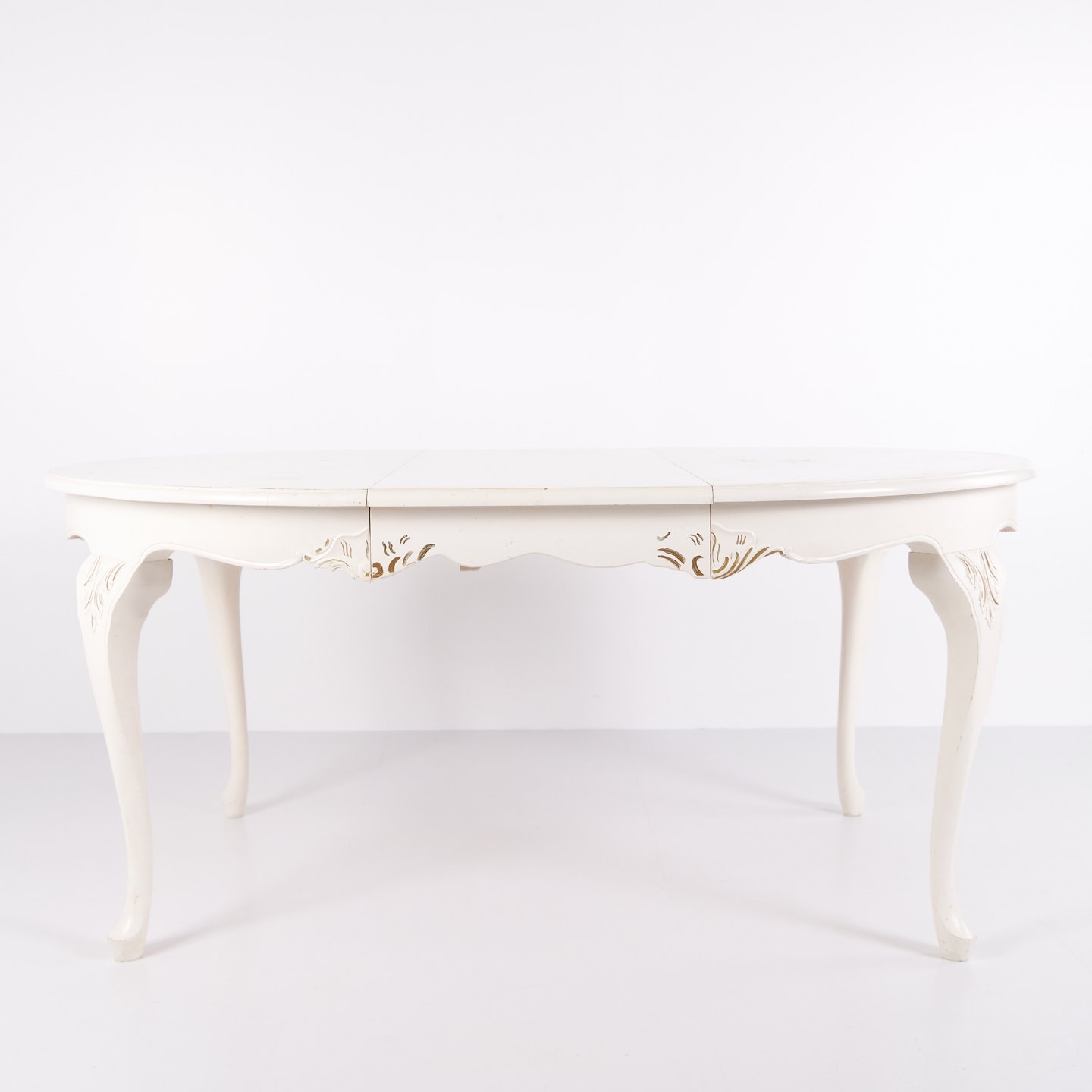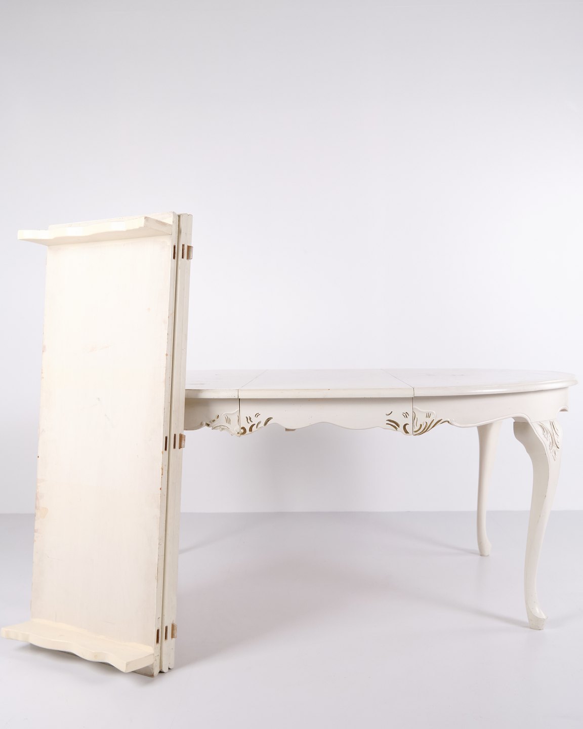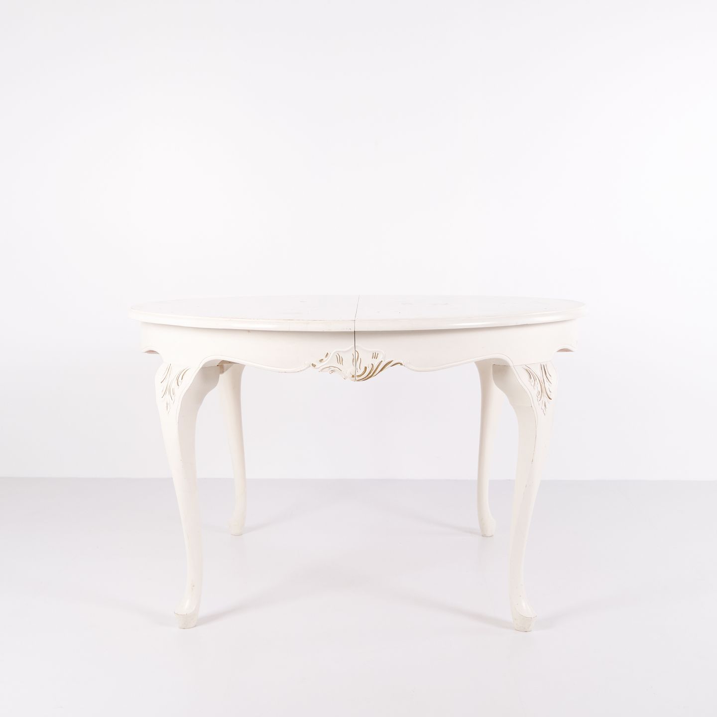 Antique round dining table in neo rococo style from the 1920s. White painted with decorative details and 4 extension leaves.— Style: Neo rococo