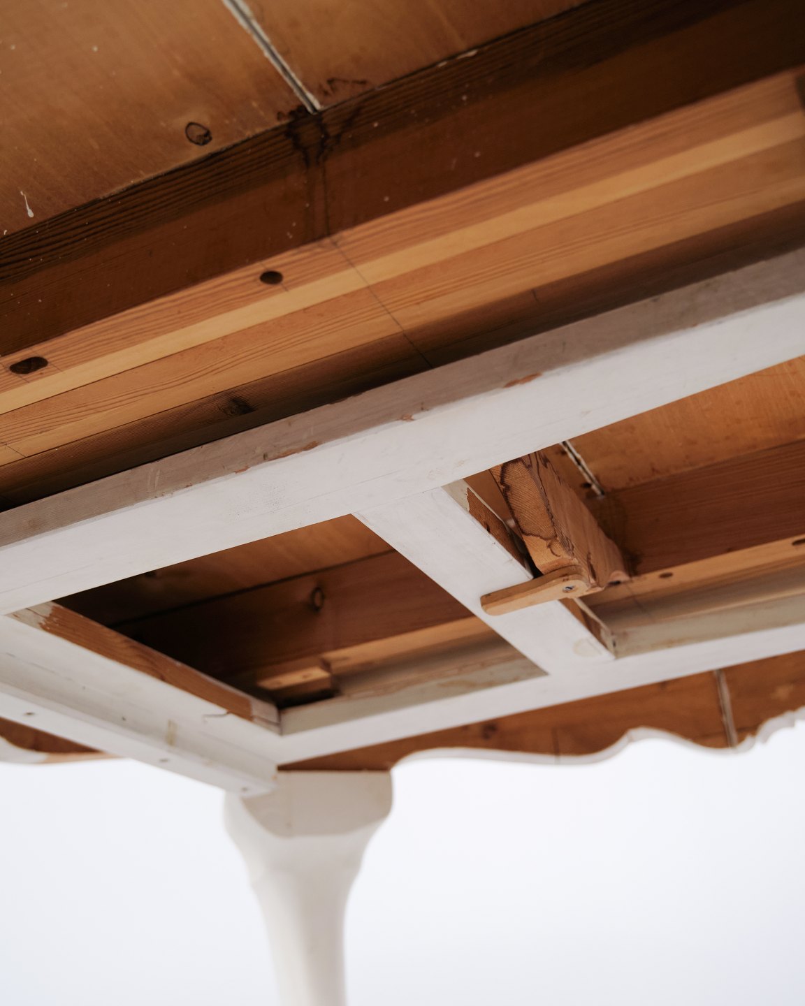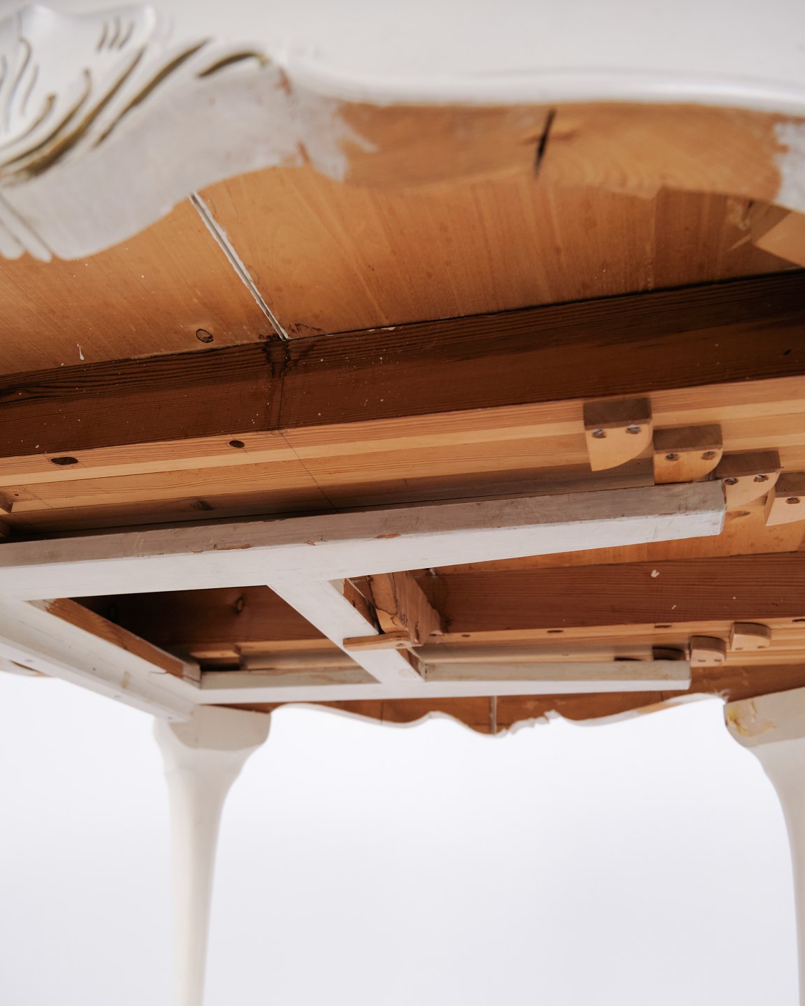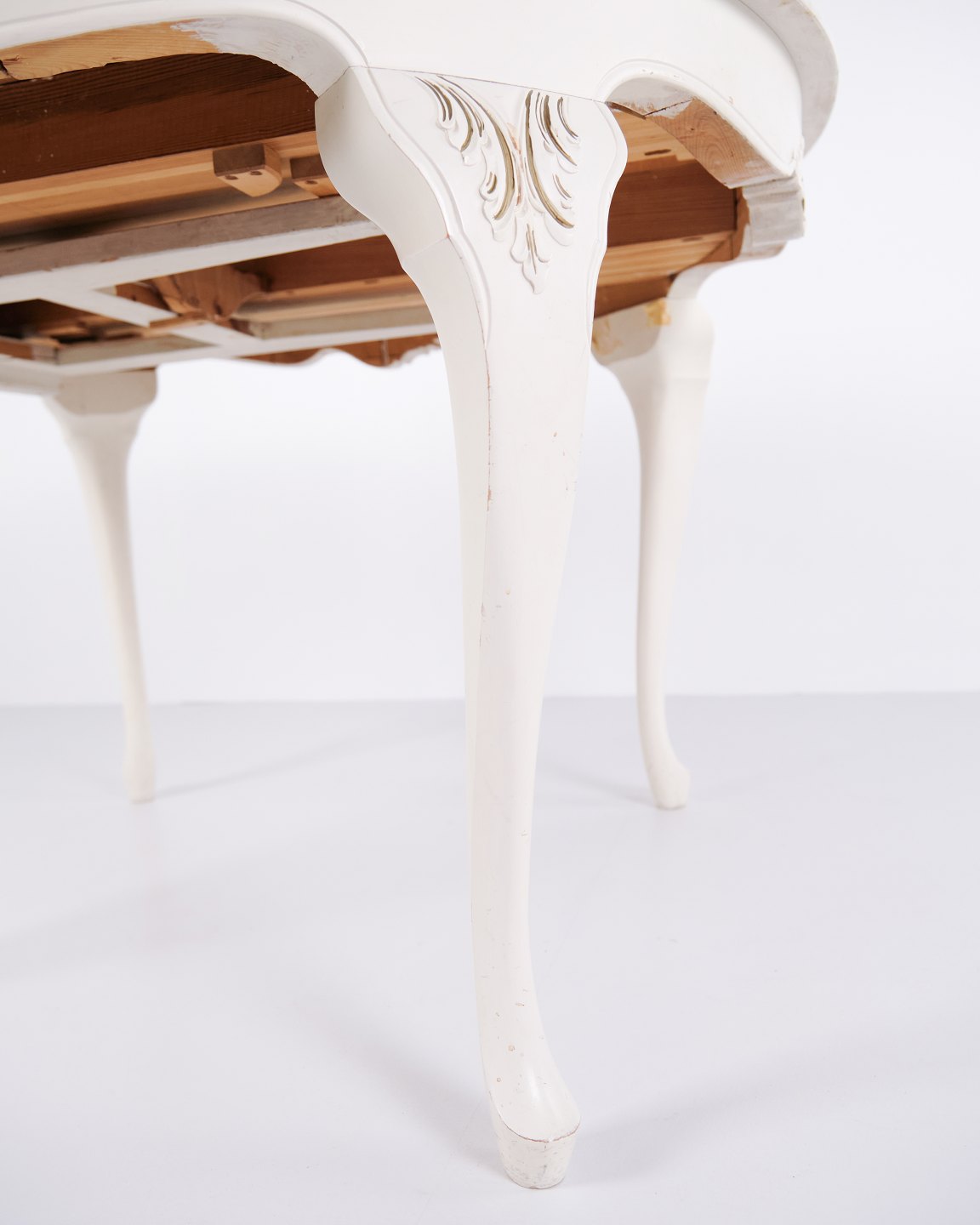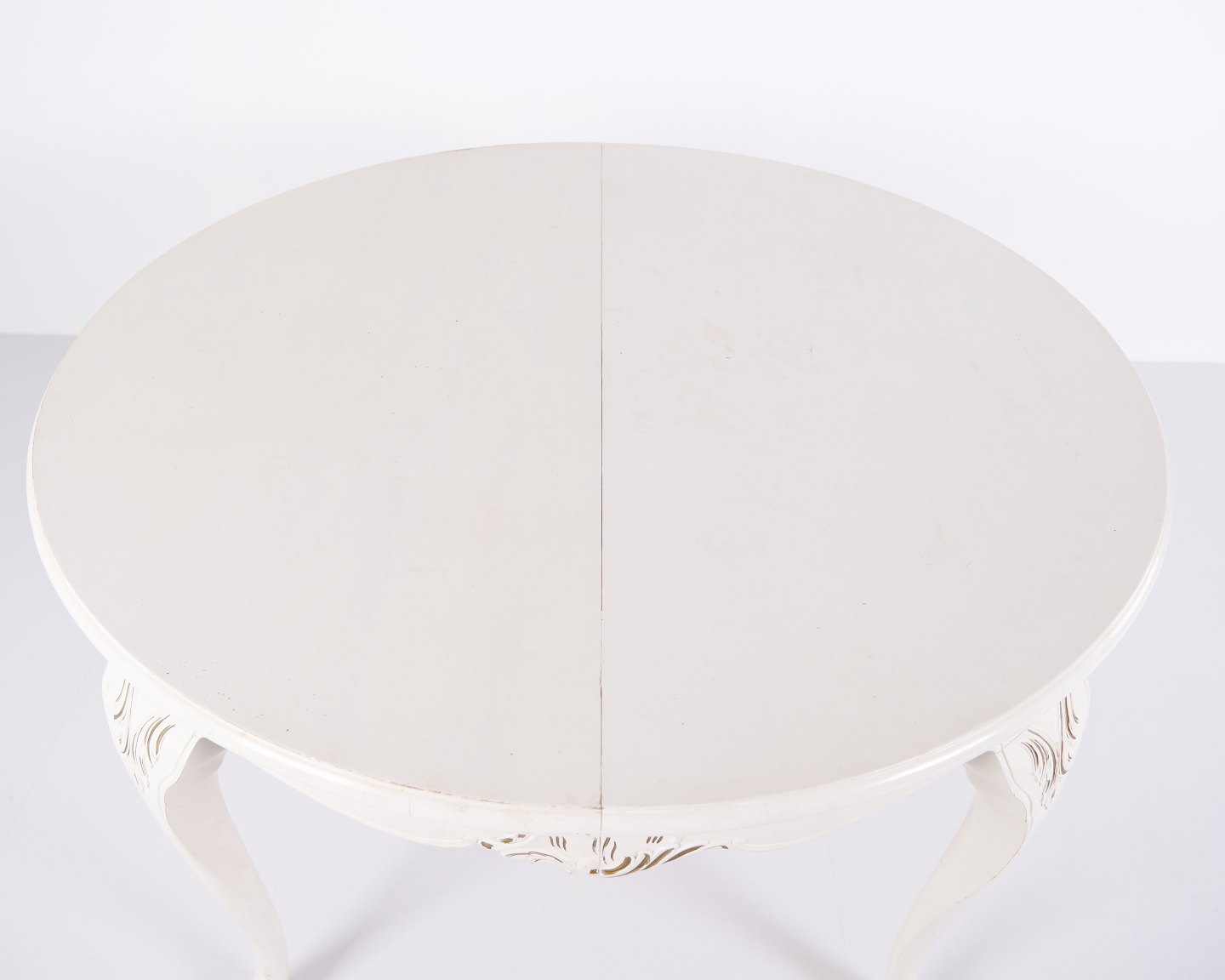 Antique round dining table in neo rococo style from the 1920s. White painted with decorative details and 4 extension leaves.— Style: Neo rococo