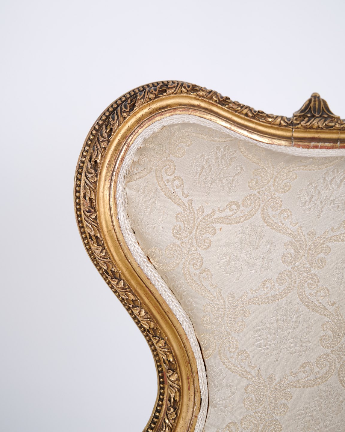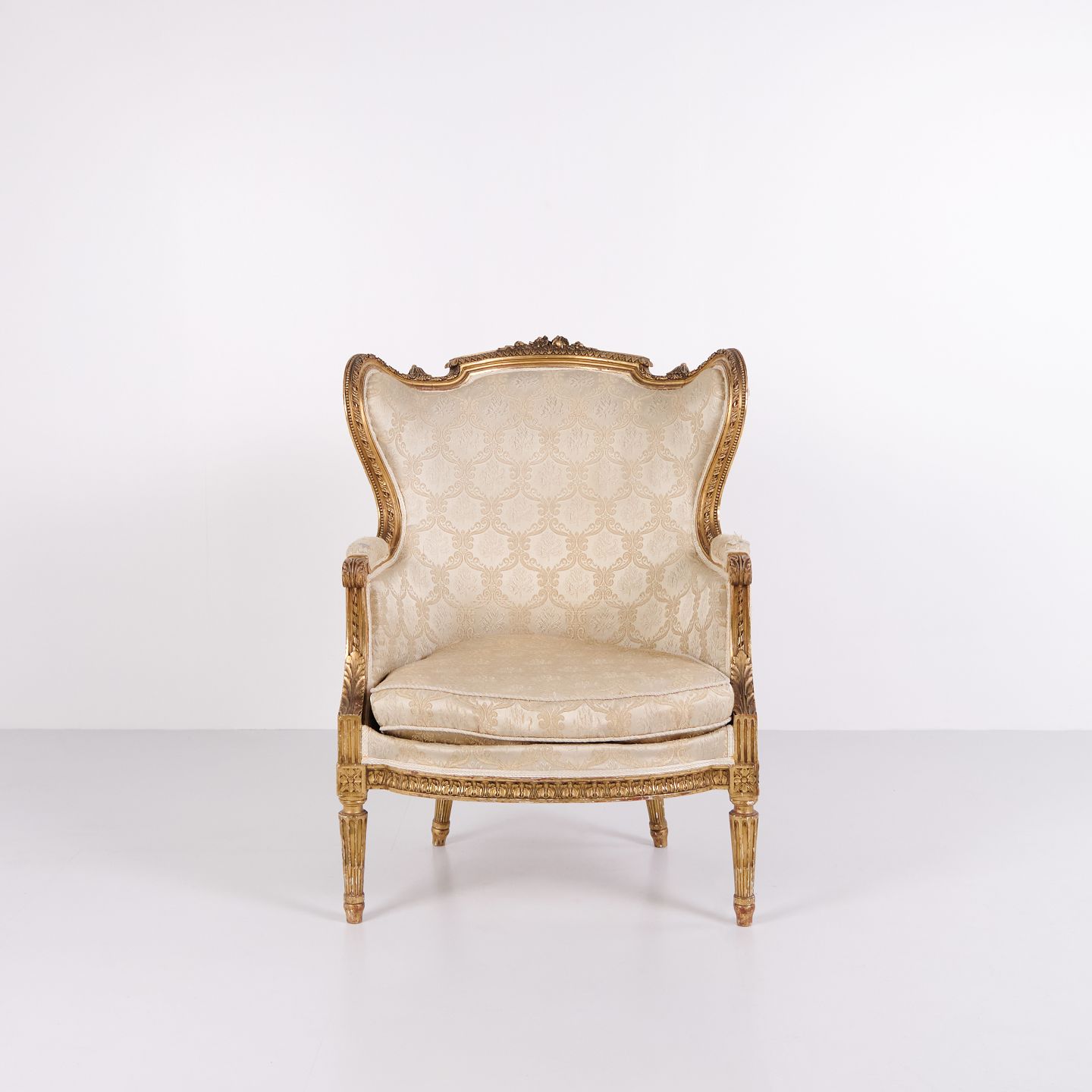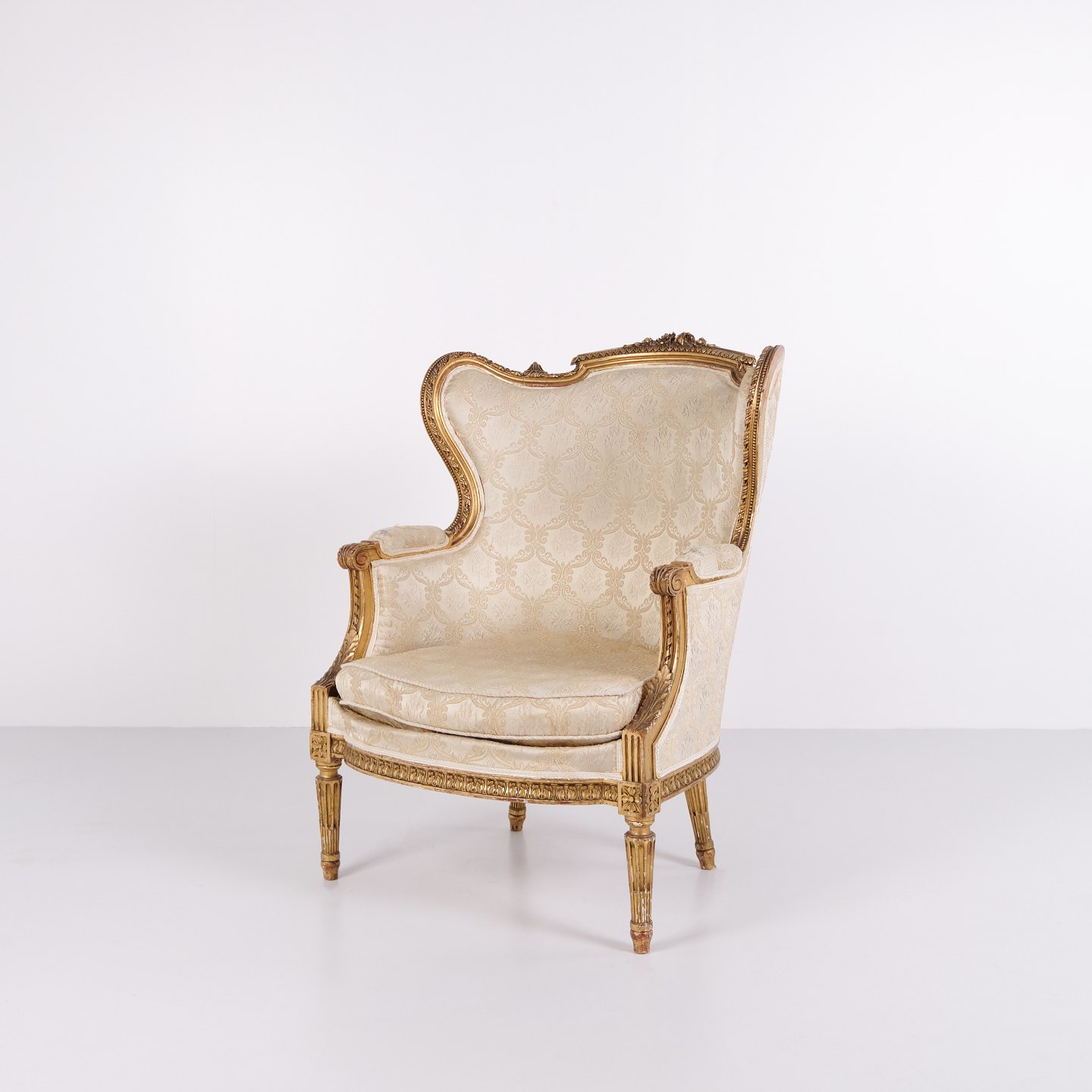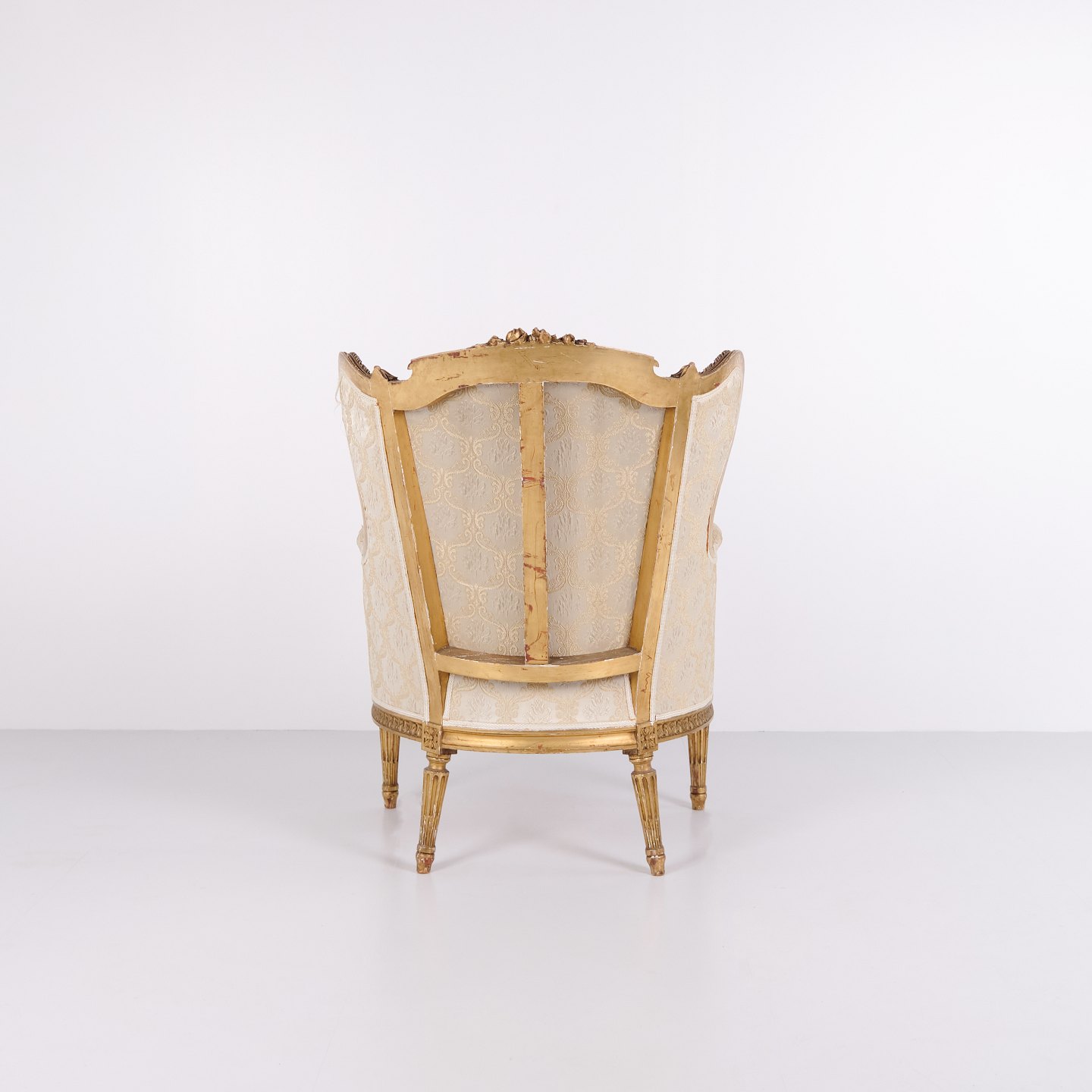 Antique bergère armchair from the 1860s in Louis XVI style. Gilded wood and light upholstery.— Style: Louis XVI