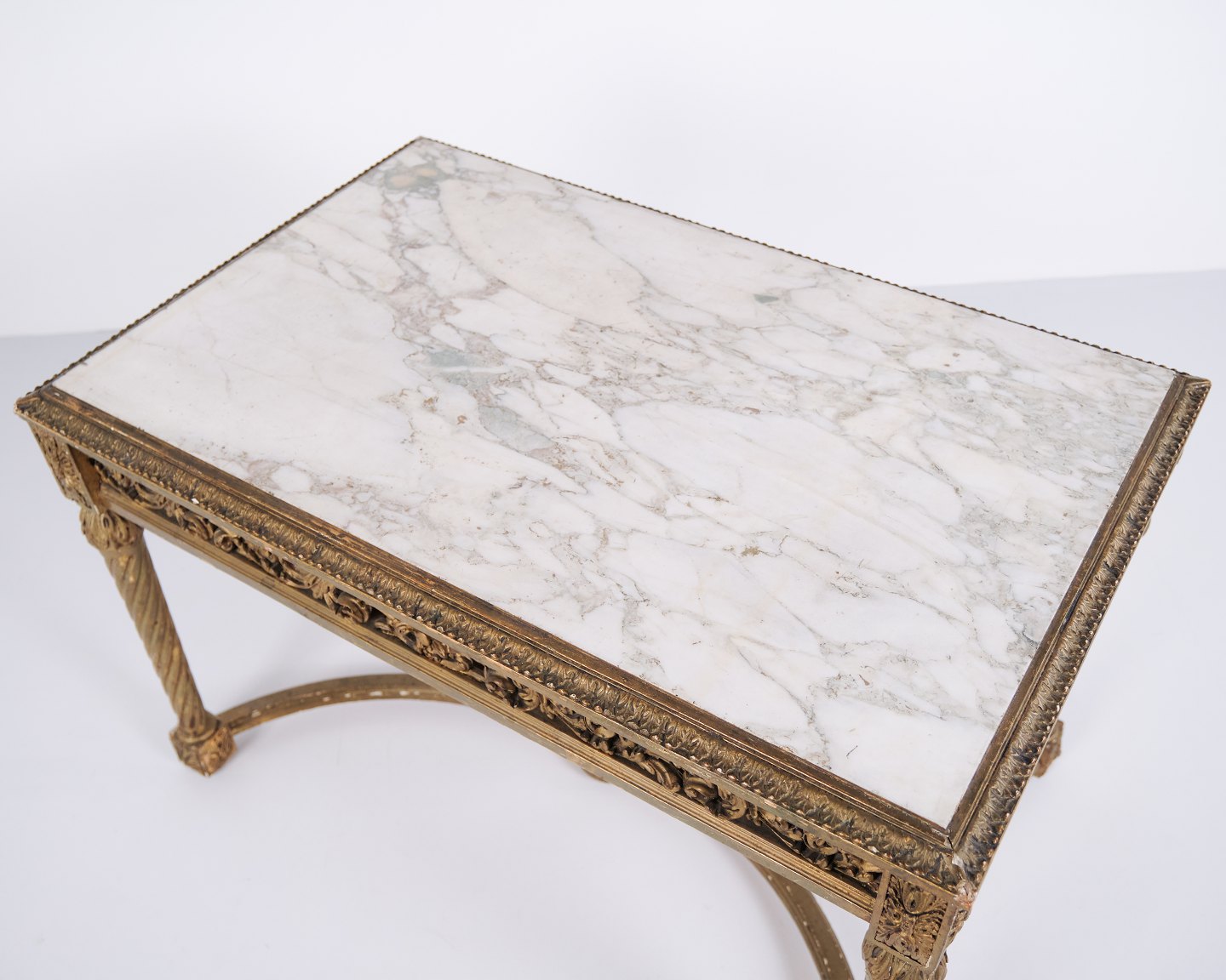 Antique Louis XVI salon table from the 1850s with marble top, gilded wood and detailed carvings. Louis XVI furniture style from the 19th century.— Style: Louis XVI