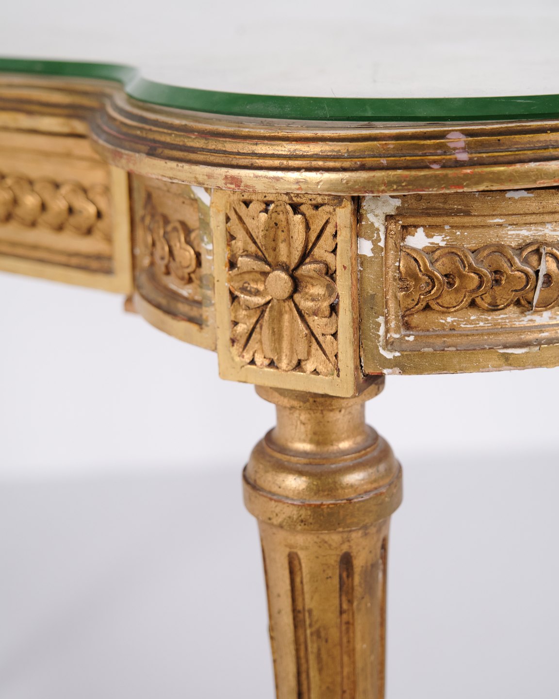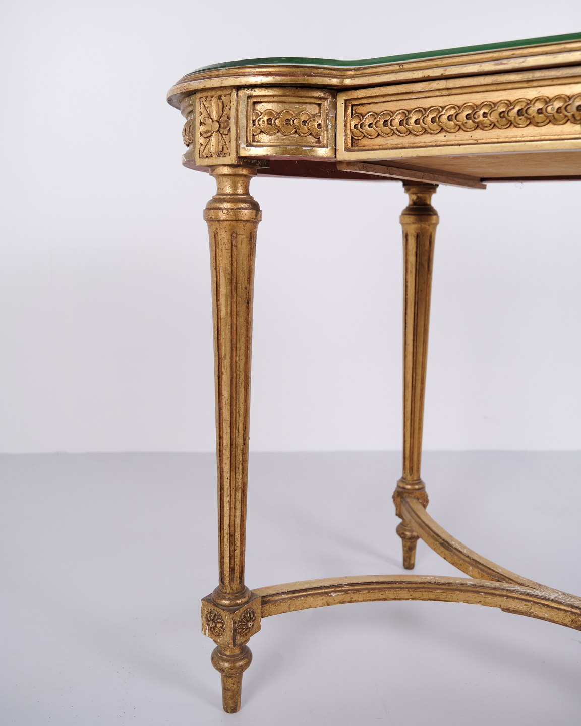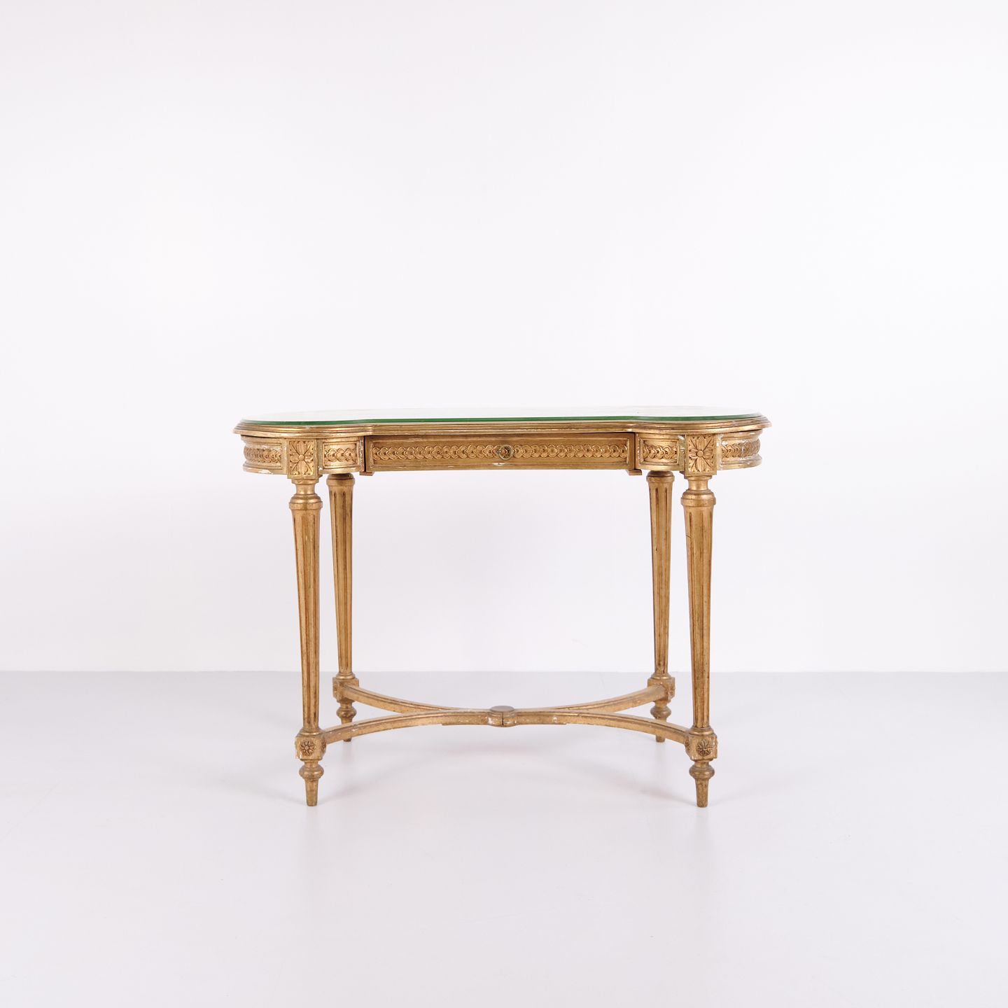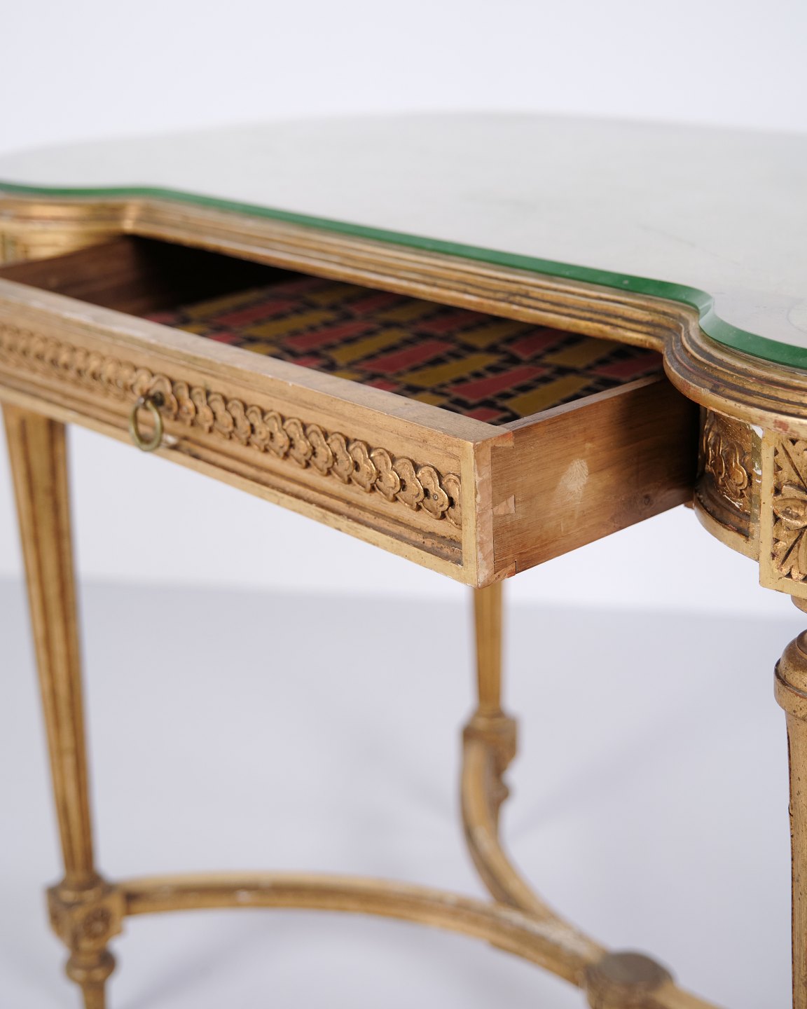 Antique desk from the 1850s in Gustavian/Louis XVI style, gilded wood, glass top and drawer.— Style: Gustavian / Louis XVI