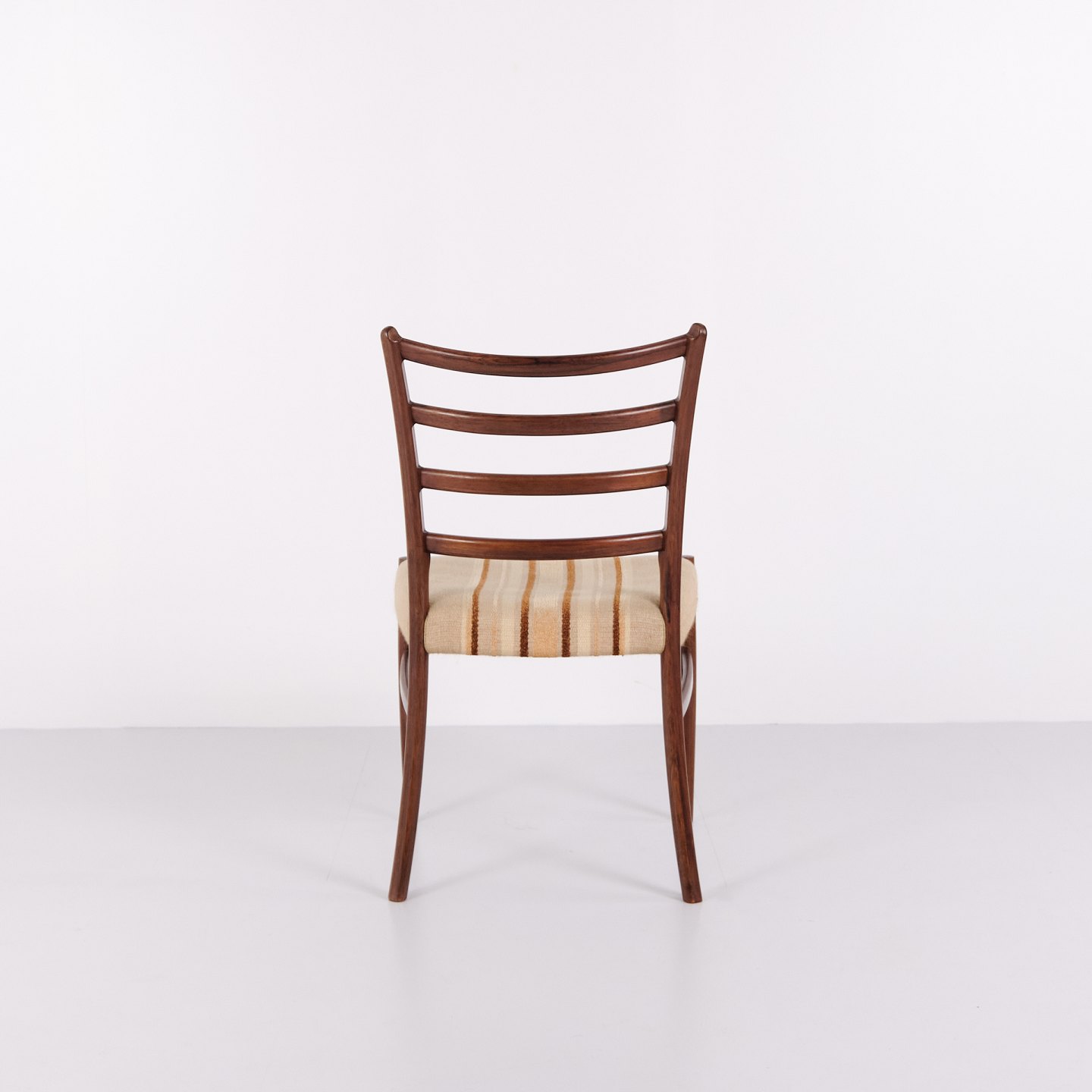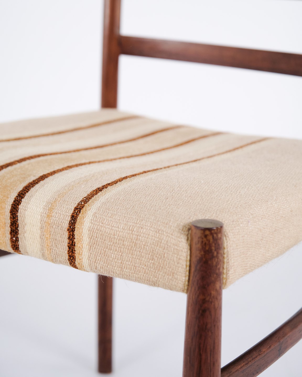 N.O. Møller dining chairs in rosewood with striped upholstery from the 1960s. Designed by J.L. Møllers Møbelfabrik.— Designer: N.O. Møller