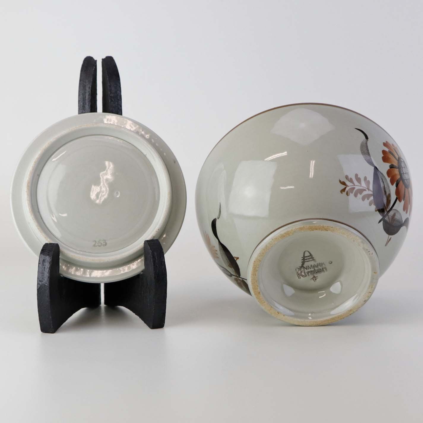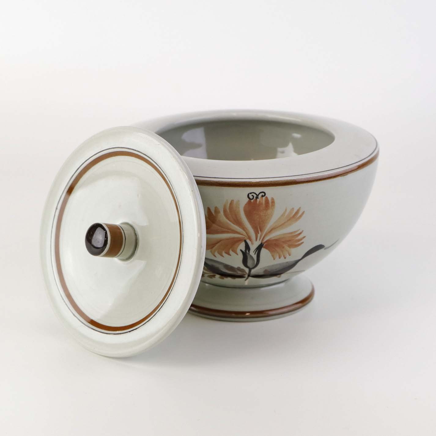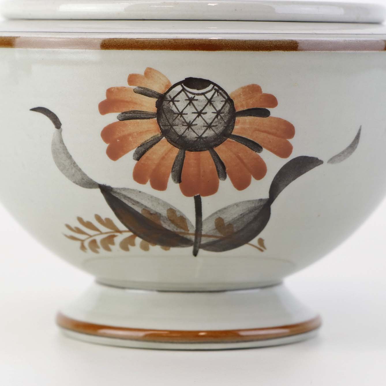 Fajancestellet er i stelformen Viktoria II med dekoration af orangebrune blomster på gråtonet baggrund med brun kant.