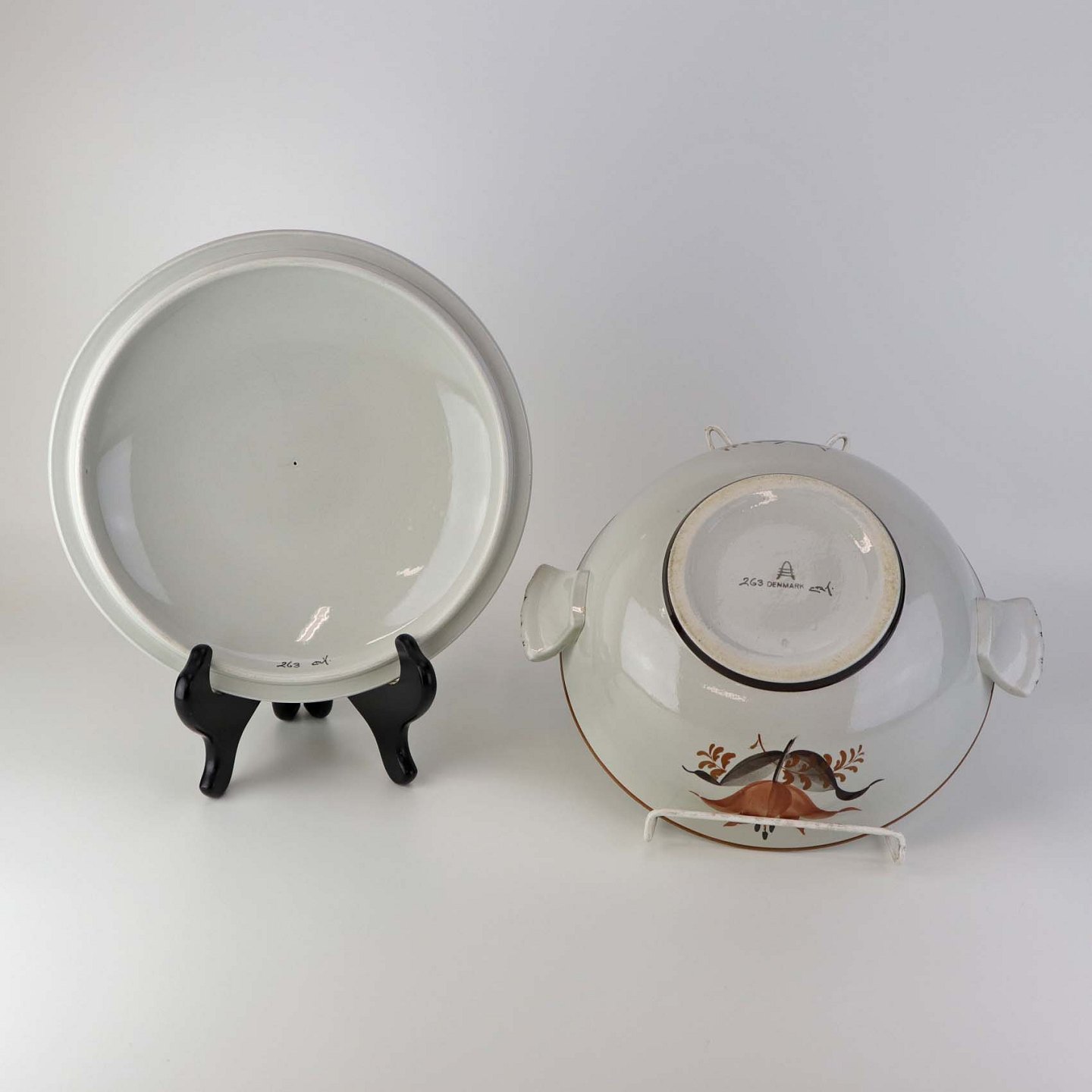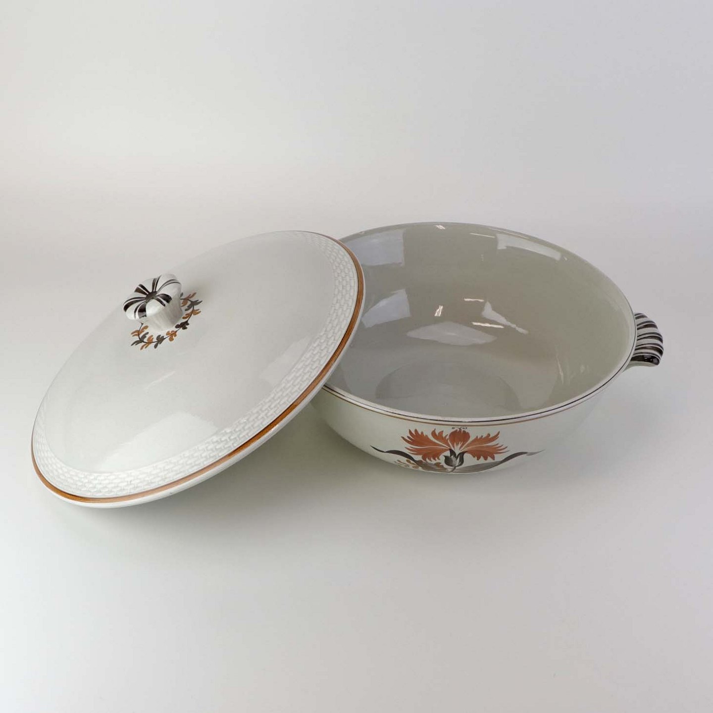 Fajancestellet er i stelformen Viktoria II med dekoration af orangebrune blomster på gråtonet baggrund med brun kant.