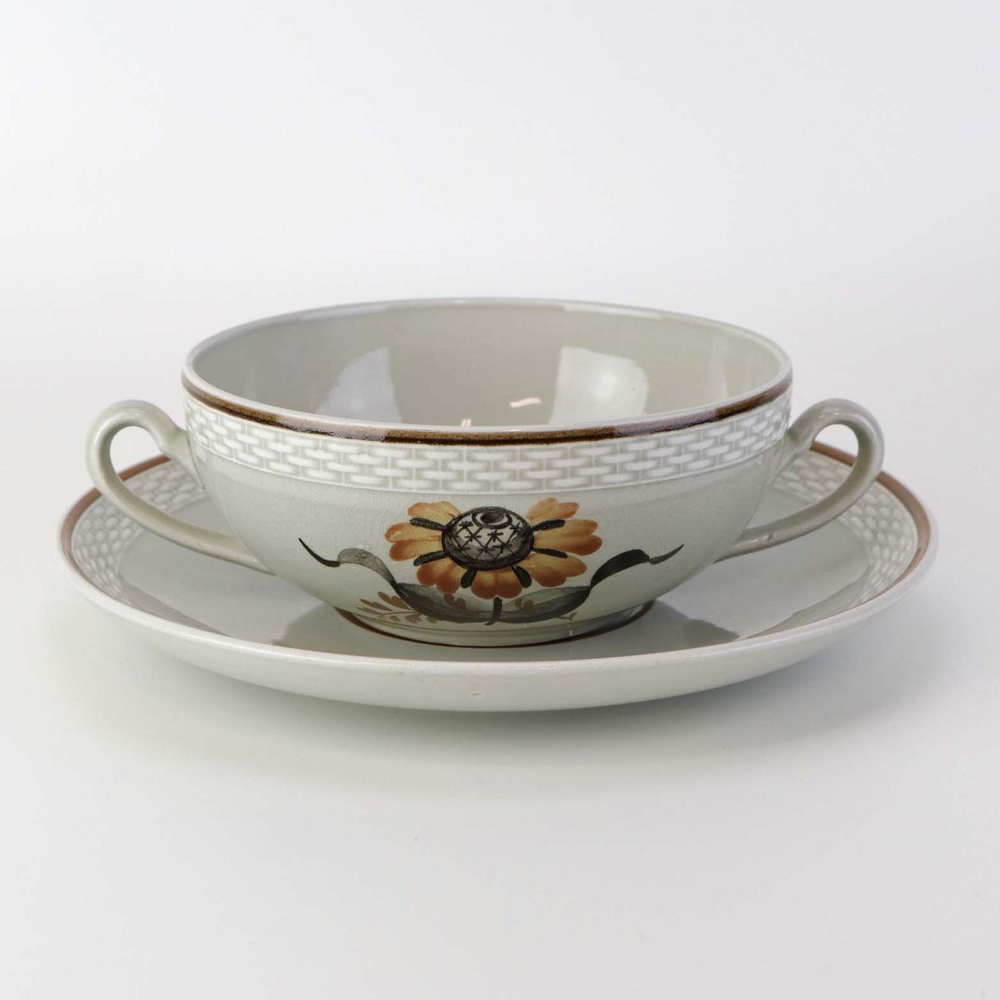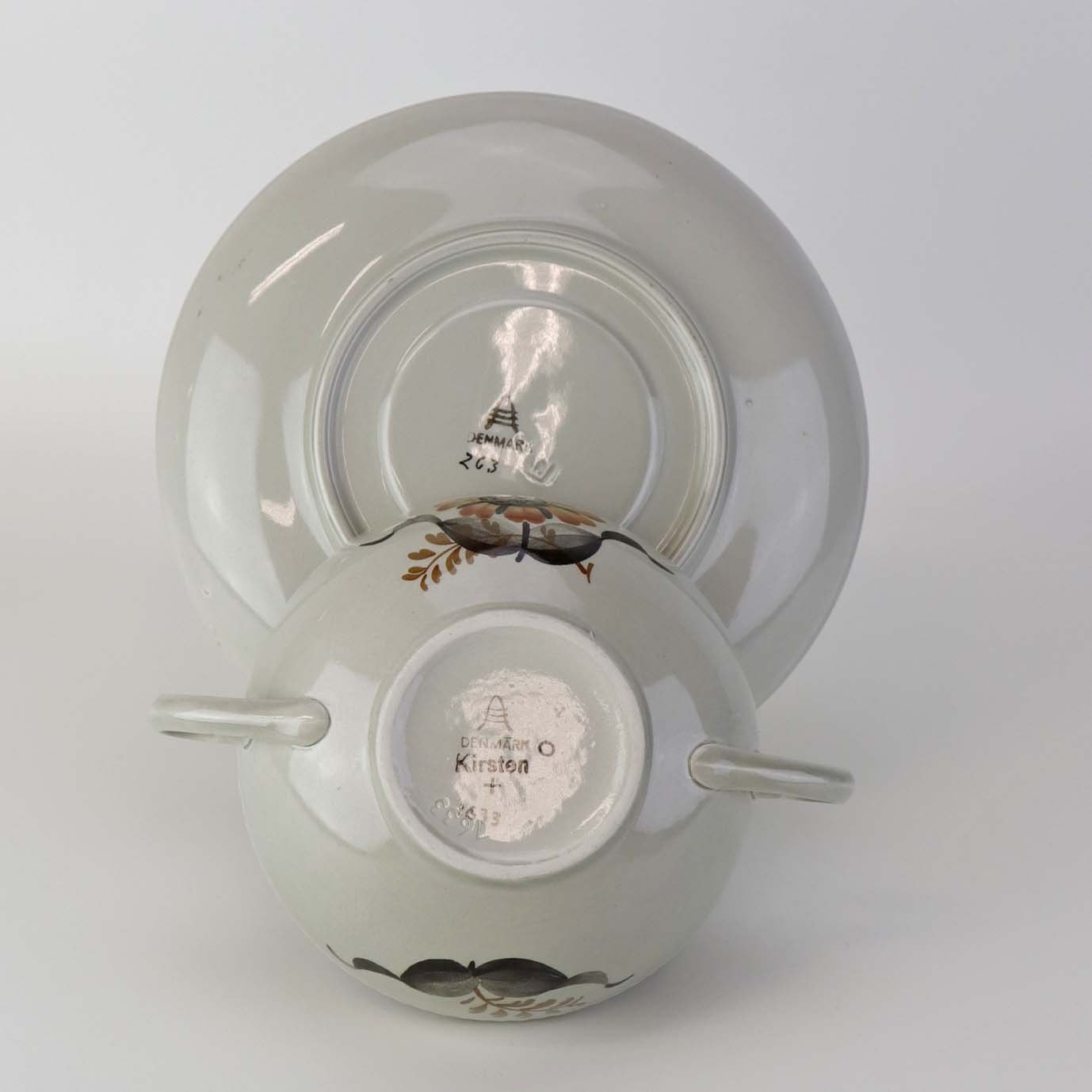 Suppekop med underkop i fajance fra stellet Kirsten, som blev fremstillet i perioden 1934-1957. Nr. 263/1633Fomgiver Nils Thorsson