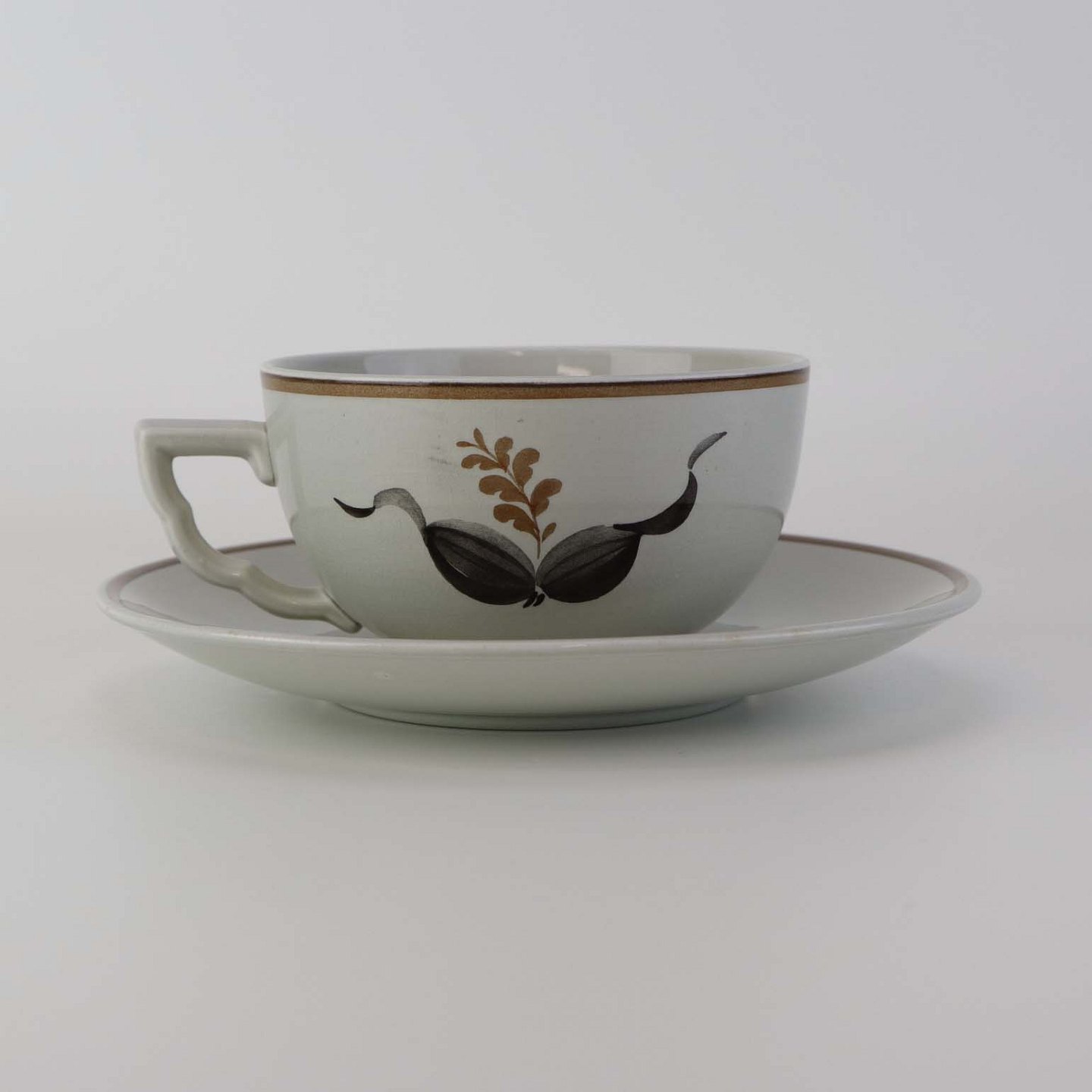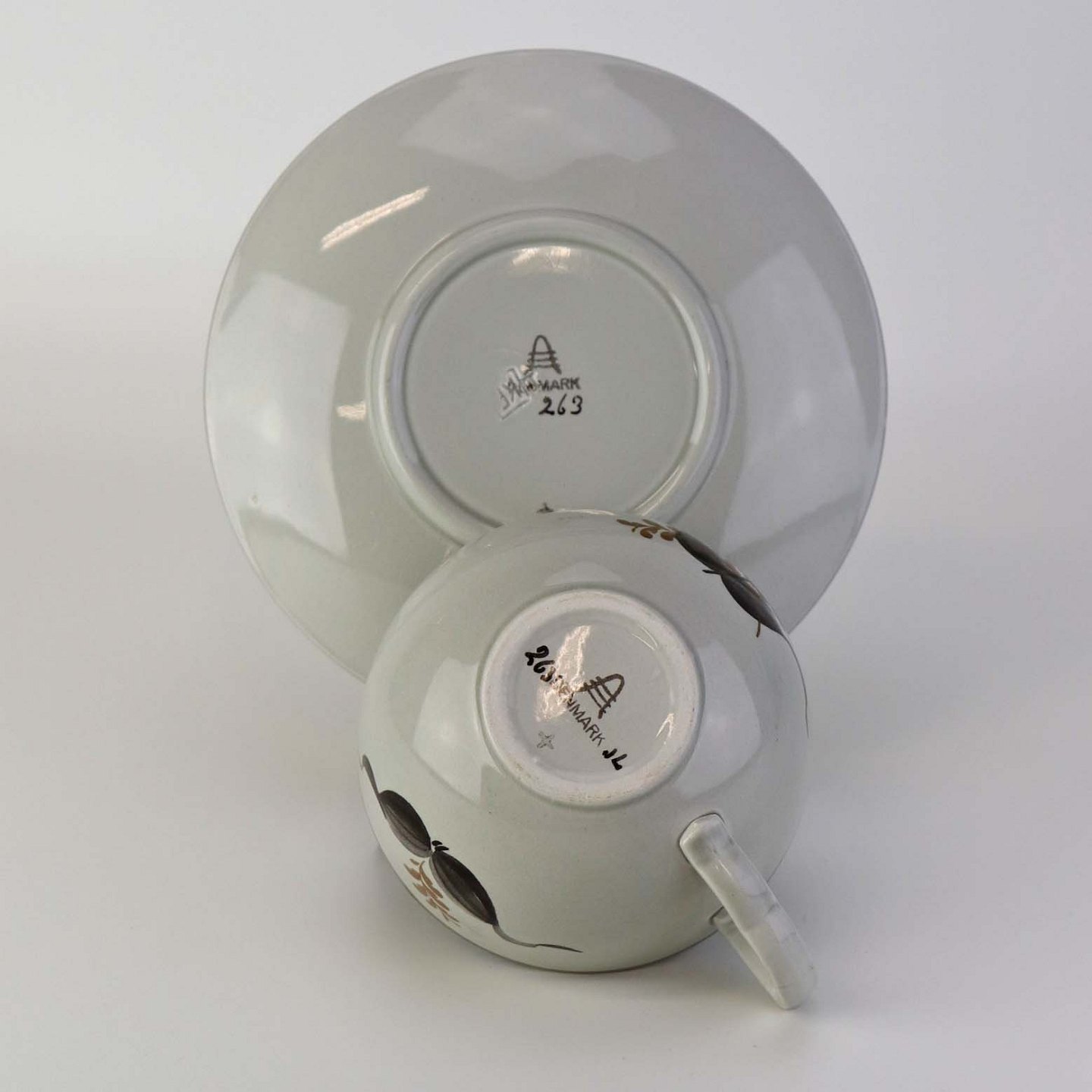 Tekop med underkop i fajance fra stellet Kirsten, som blev fremstillet i perioden 1934-1957. Nr. 263Fomgiver Nils Thorsson