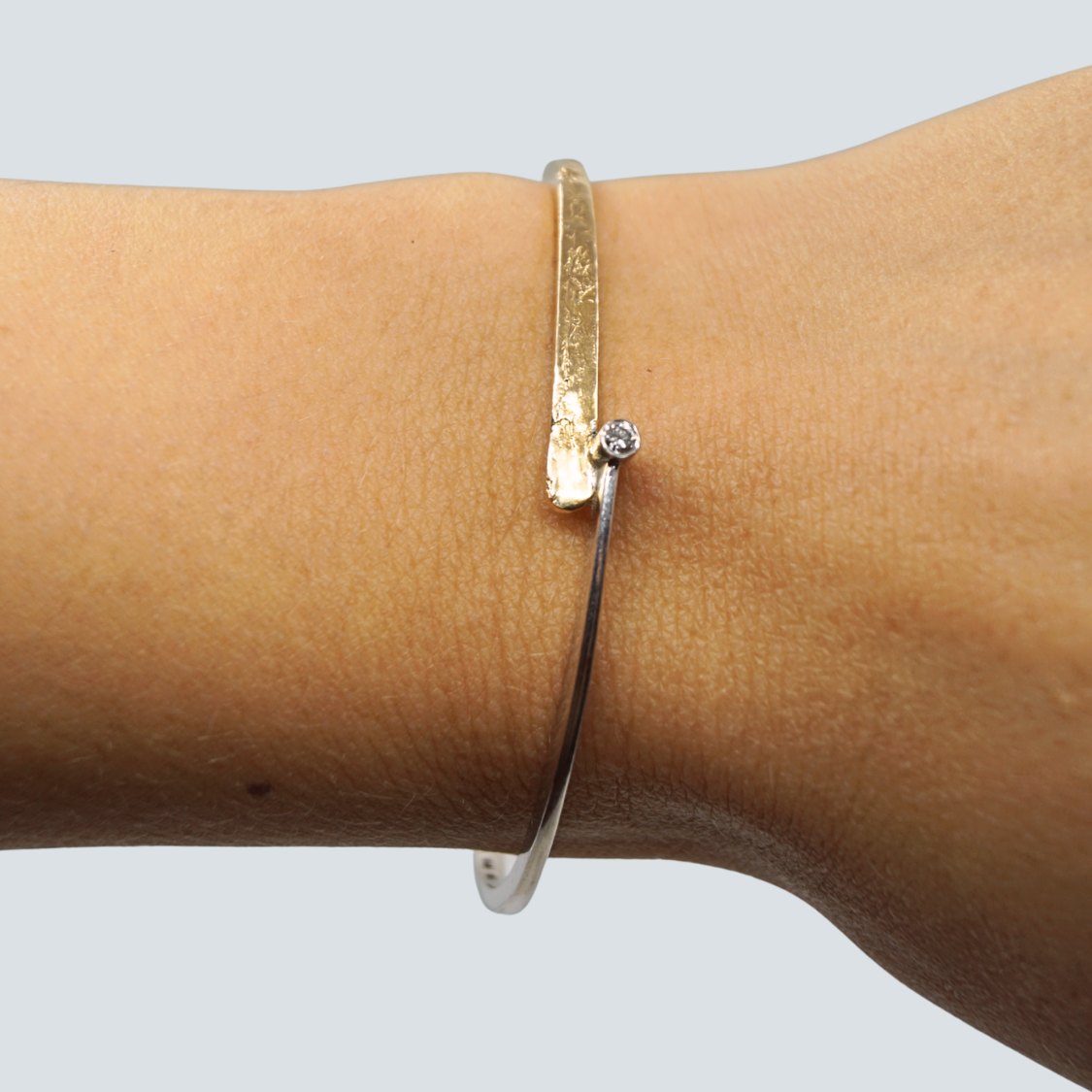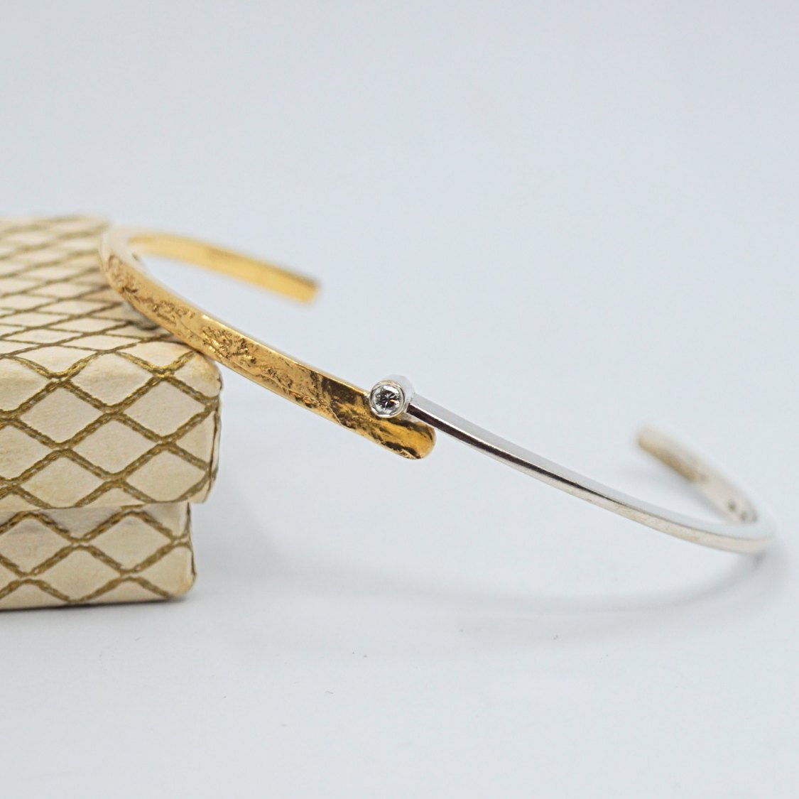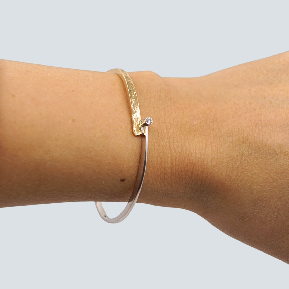 Gold bangle in 14k gold and white gold, set with a diamond mounted in white gold.Inner measures 5,6 cm x 5 cm.