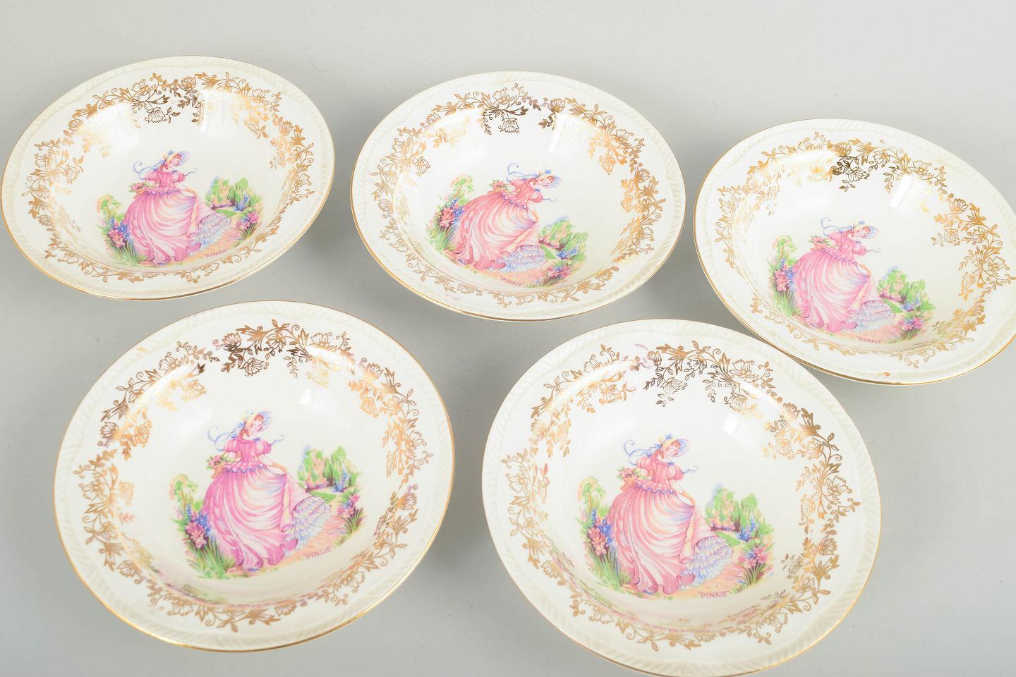 Royal Alma, England, set of 5 bowls, c. 1930s.Set of five faience bowls with a pastel printed decoration featuring a central figure scene, framed by an ornate gilt leaf-scroll border around the rim.