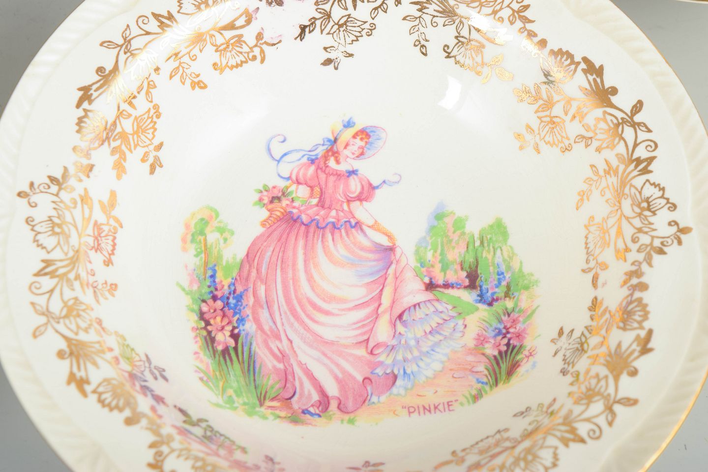 English faience from the interwar period was widely produced as decorative yet accessible tableware, often using printed imagery and elaborate borders to create an elegant look. During the 1930s, romantic figure scenes and gilt accents were popular design elements, lending everyday services a more festive, display-worthy character.