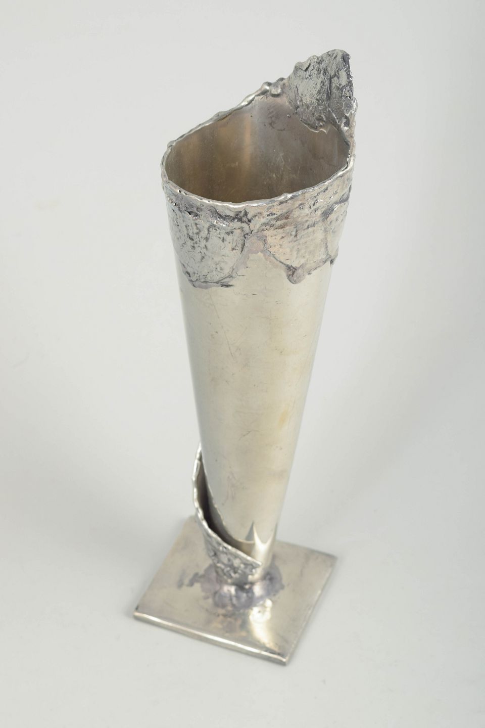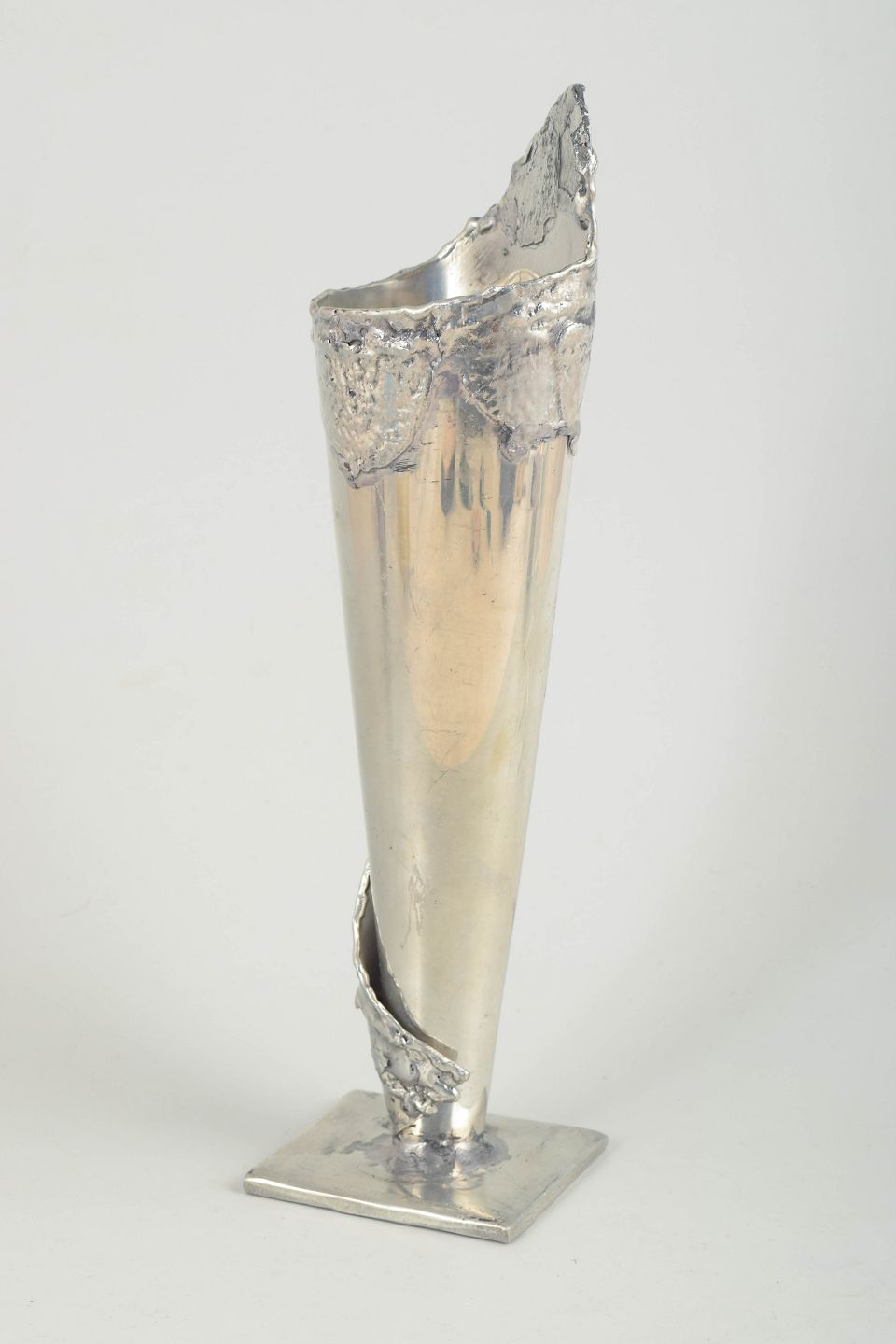 Bengt Berggren, large pewter vase in brutalist style, 1980s.Sculptural pewter vase with a tall conical body and a raw, organic rim featuring textured detailing. Set on a square base.