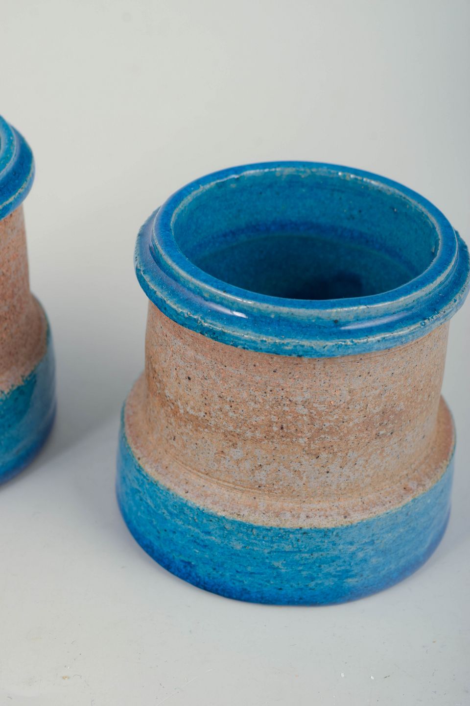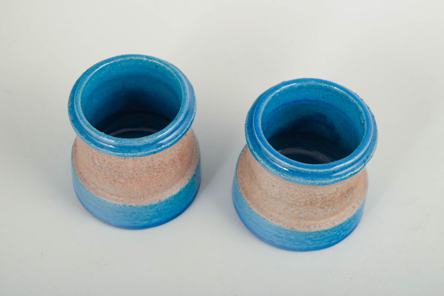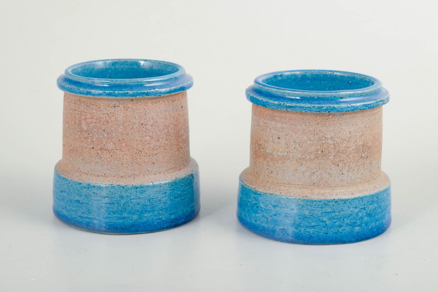 Nils Kähler, pair of small vases.Pair of small cylindrical vases in thrown stoneware with a glossy blue glaze at the base and rim, combined with a sand-coloured unglazed central section. Simple, functional forms characteristic of Danish modernism from the 1960s.