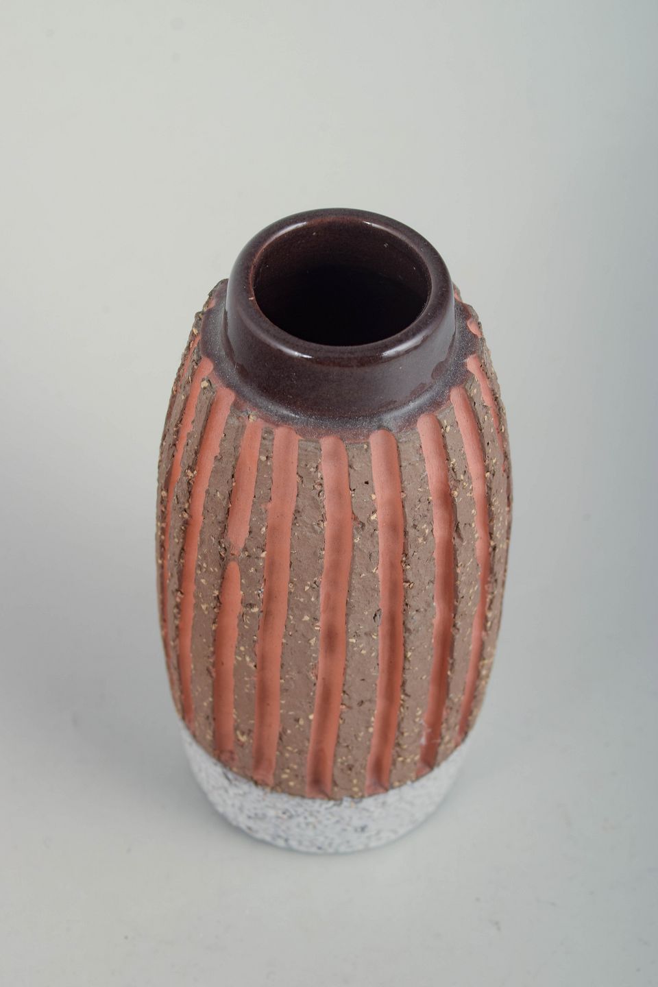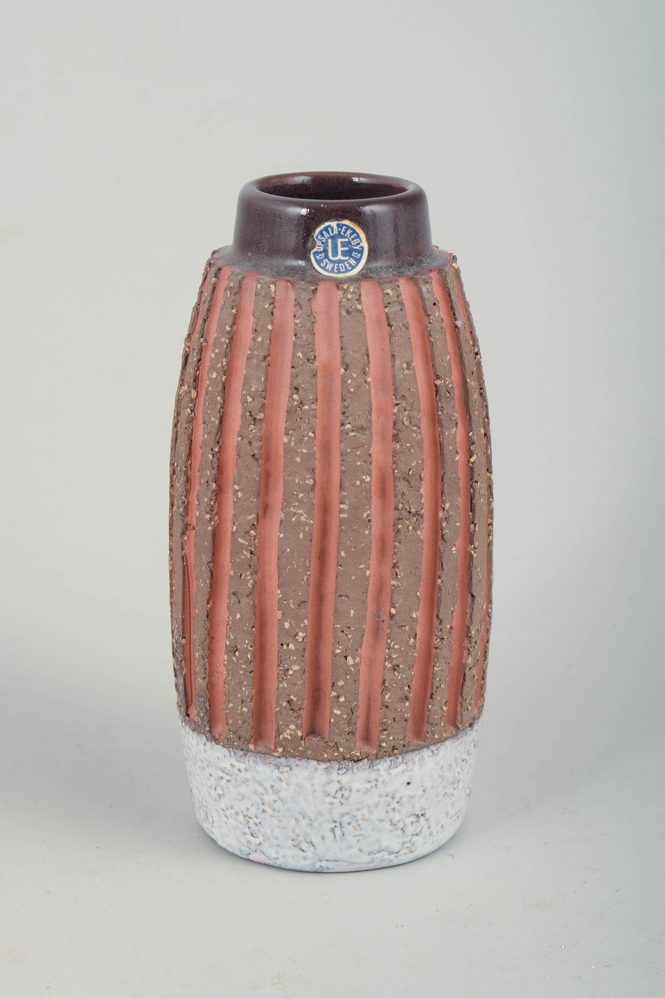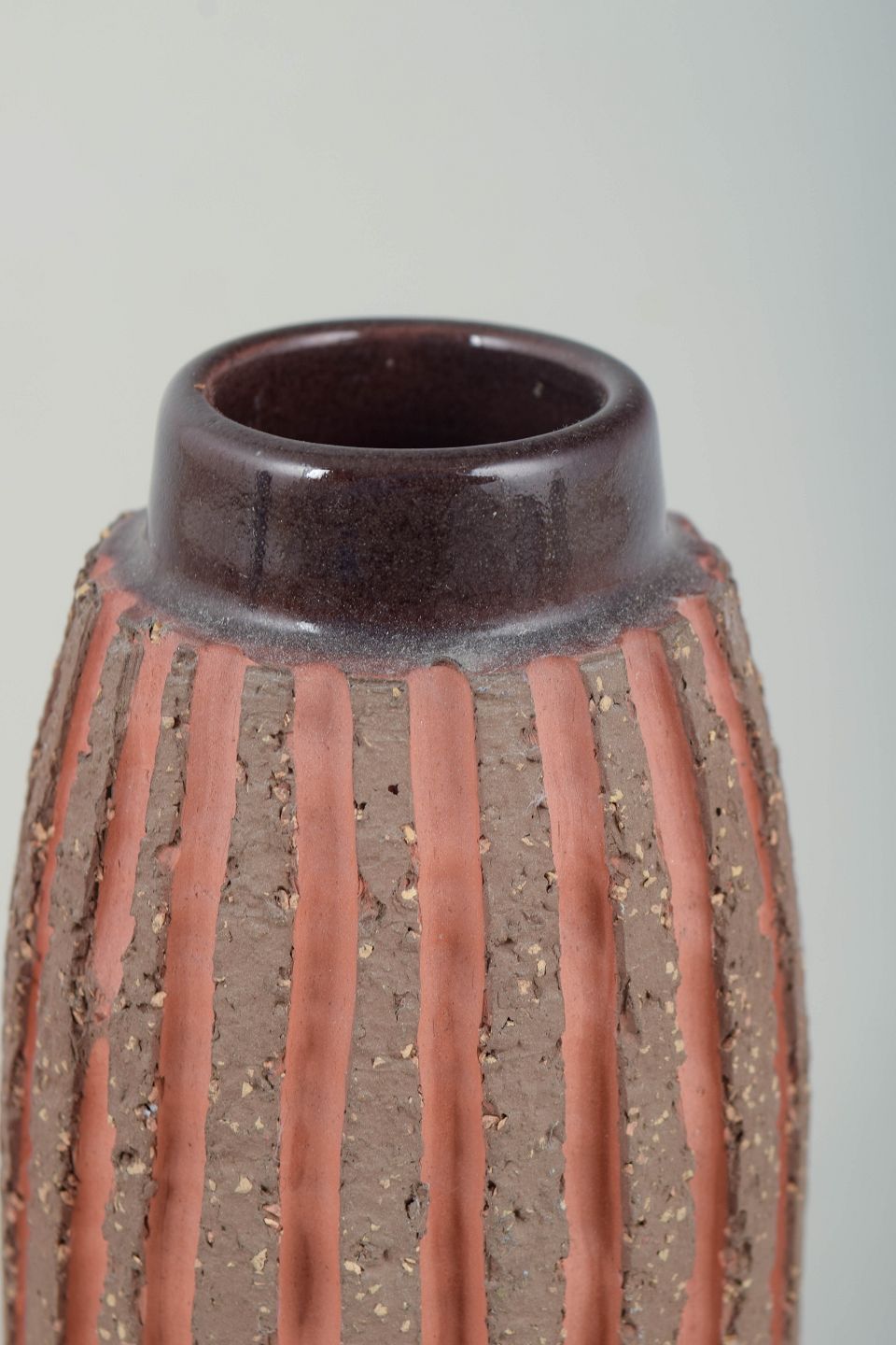 Mari Simmulson for Upsala Ekeby, vase.Small cylindrical glazed ceramic vase with a slightly narrowed neck. The body is decorated with vertical relief-applied stripes in terracotta tones against a darker, lightly speckled ground glaze, finished with a light, coarsely textured base. The decoration creates a strong tactile and modernist expression. Model number 4594.