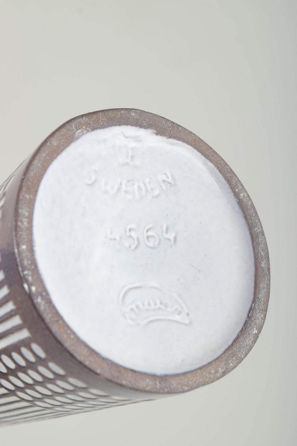 Mari Simmulson (1911–2000) was a Swedish ceramic artist and designer who worked for many years at Upsala Ekeby. She is recognised for her boldly graphic decoration, where repetition, rhythm and contrast are central elements. Her work from the 1950s and 60s reflects the Scandinavian modernist emphasis on clarity of form, functionality and decorative discipline. Upsala Ekeby was among Sweden’s leading ceramic producers of the period, and its production is today highly regarded by collectors.