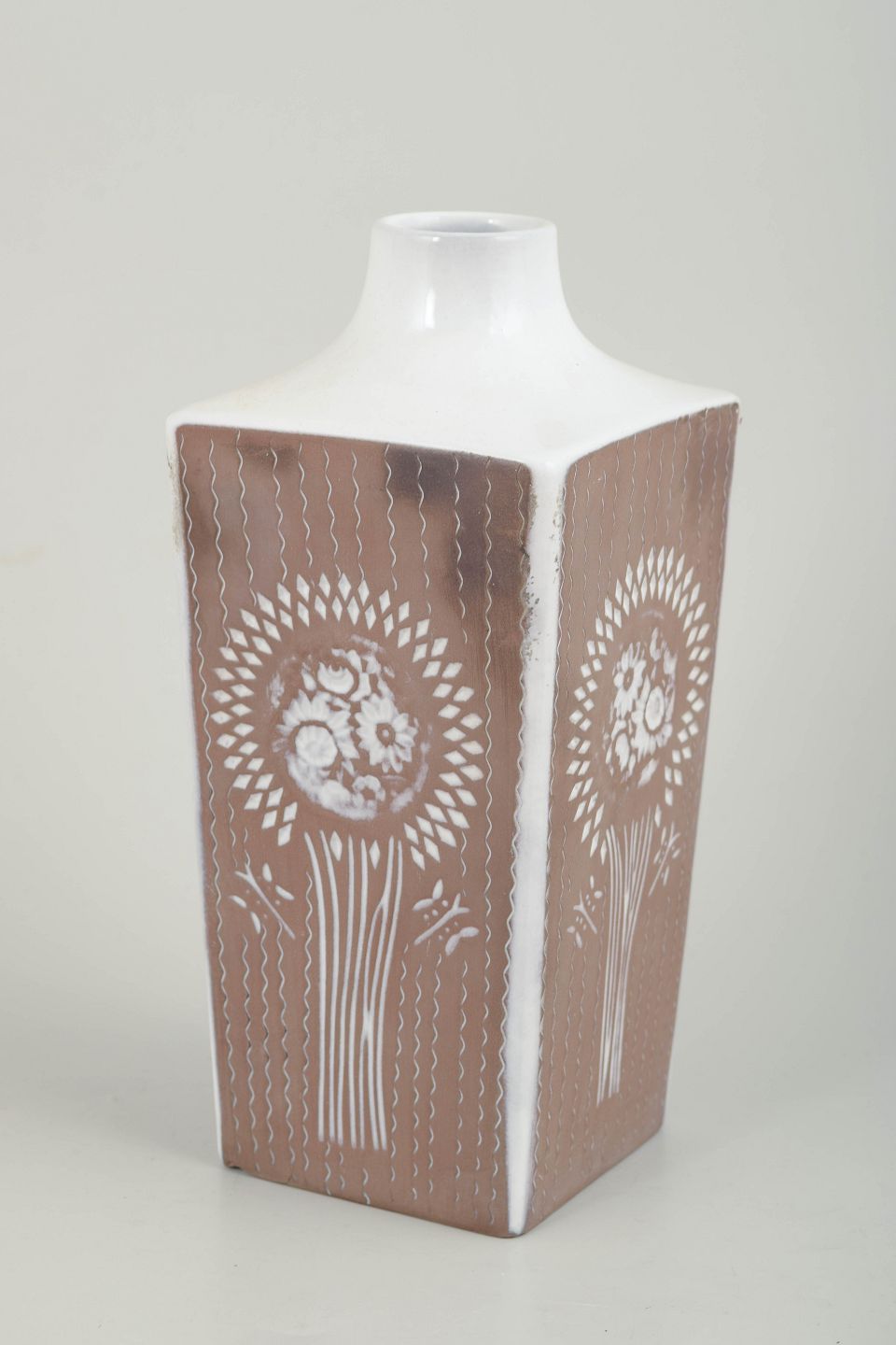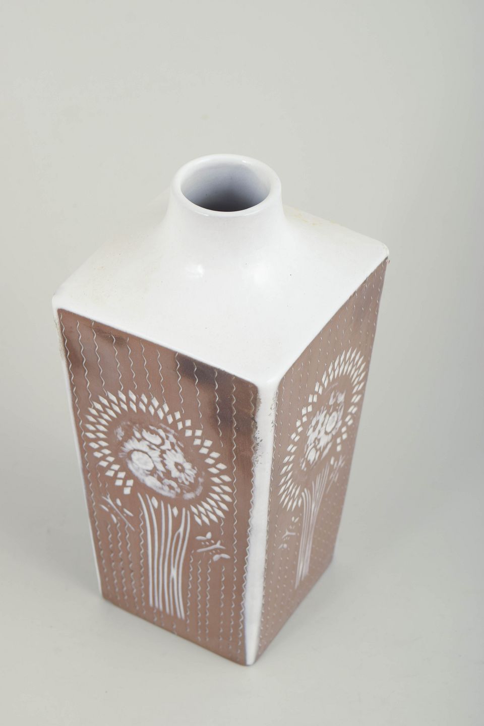 Mari Simmulson for Upsala Ekeby, vase.Faceted glazed ceramic vase with a square body and short neck. Decorated with stylised floral and radiating motifs in white against a brown ground glaze, executed in a graphic and symmetrical modernist idiom. Model number 43130/955.