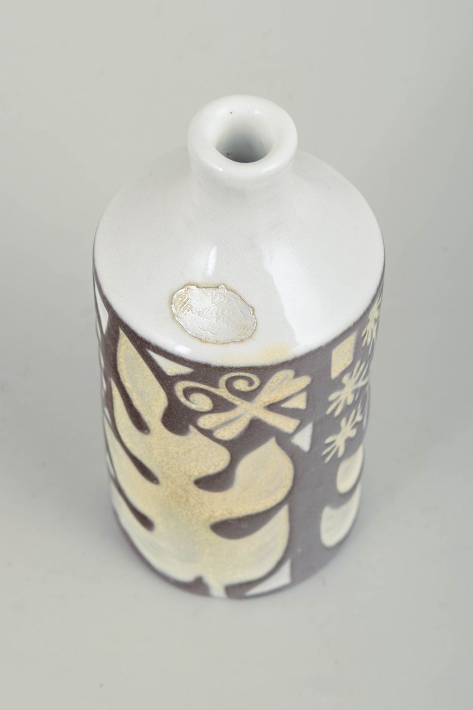 Mari Simmulson for Upsala Ekeby, vase.Cylindrical glazed ceramic vase with a narrow neck and graphic decoration in cream and brown tones against a white ground glaze. The design features stylised leaf motifs and ornamental elements with a clear modernist expression. Model number 4330/683.