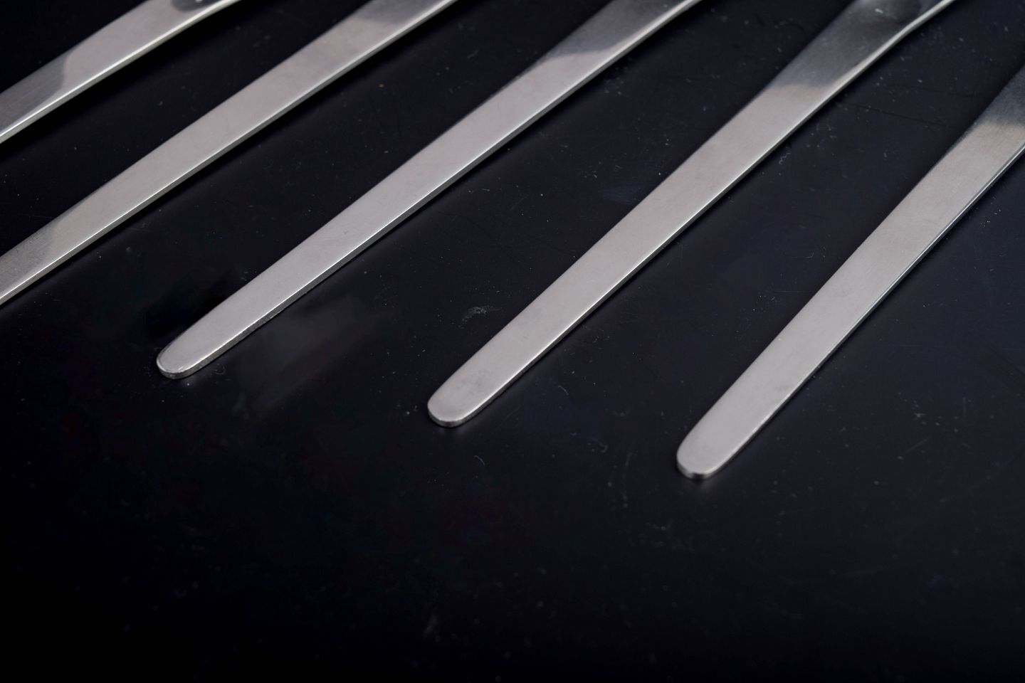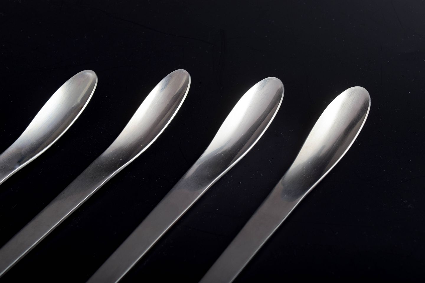 Georg Jensen, caffe latte spoons.Set comprising five long caffe latte spoons in stainless steel with a slim, minimalist design. Intended for tall glasses and mugs, suitable for coffee and dessert service.