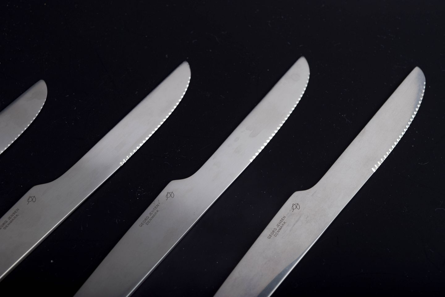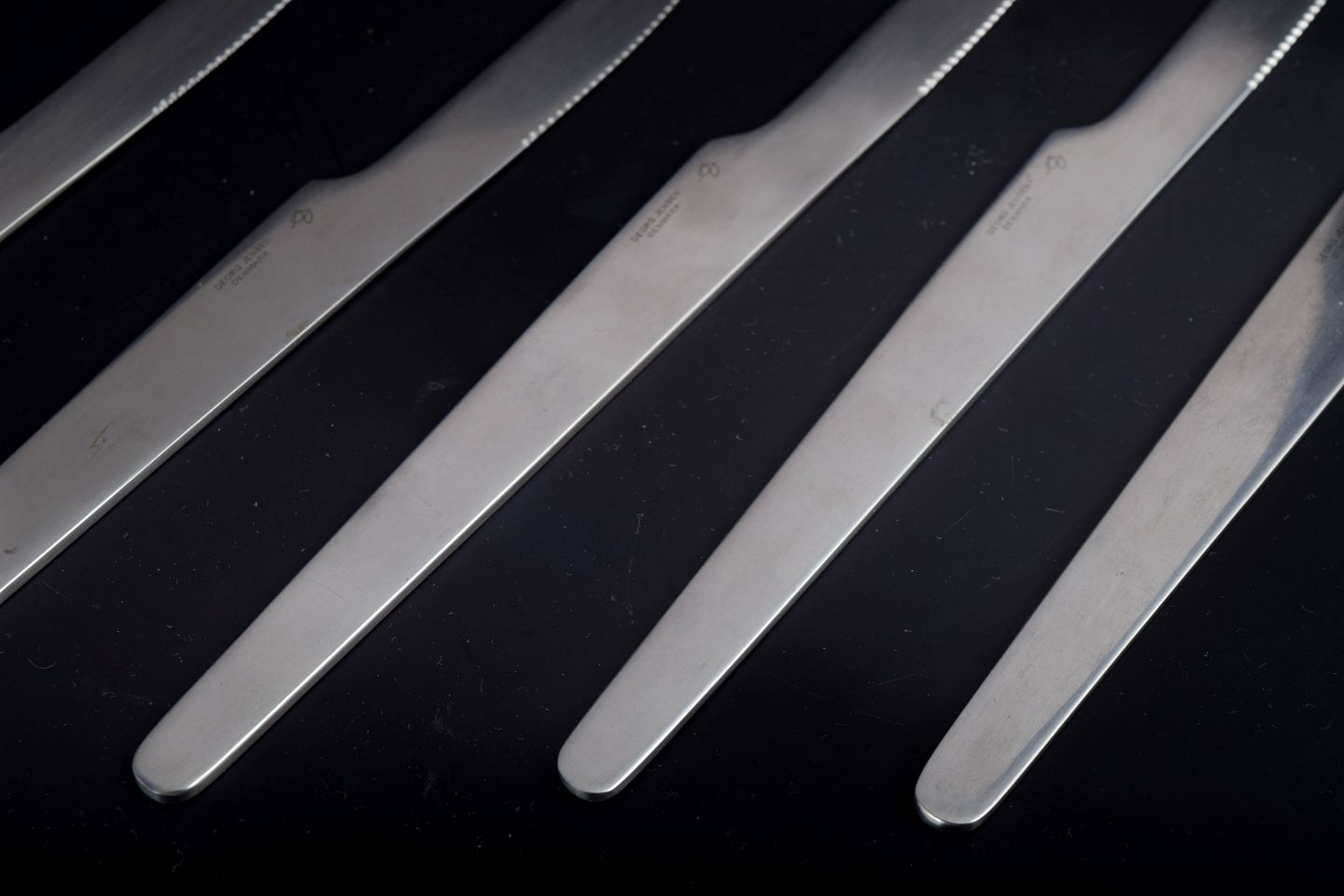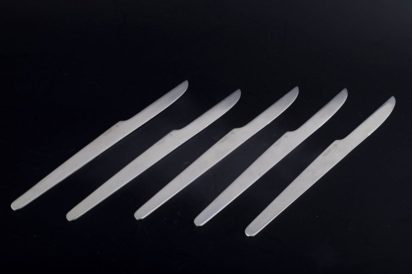 Arne Jacobsen for Georg Jensen, dinner knives.Set comprising five dinner knives in stainless steel. The knives feature the clean, functional design language characteristic of Arne Jacobsen’s cutlery designs and were produced by Georg Jensen. The model dates to the 1980s.