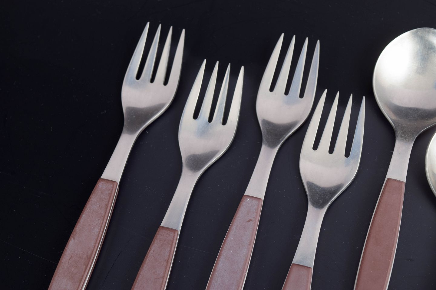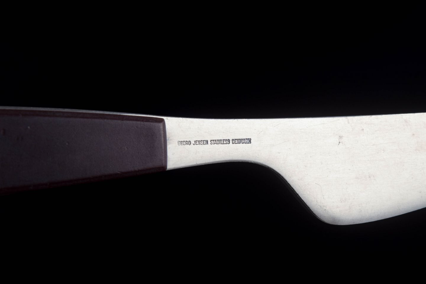 Henning Koppel for Georg Jensen, Strata cutlery set for 4 persons.Set comprising four dinner knives, four dinner forks, and four table spoons in stainless steel with brown handles. The model is from the Strata series.