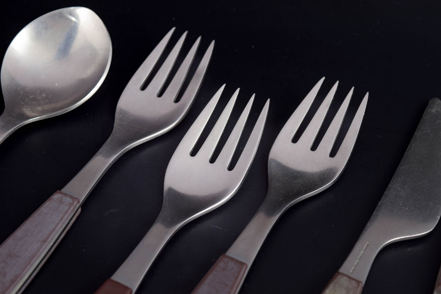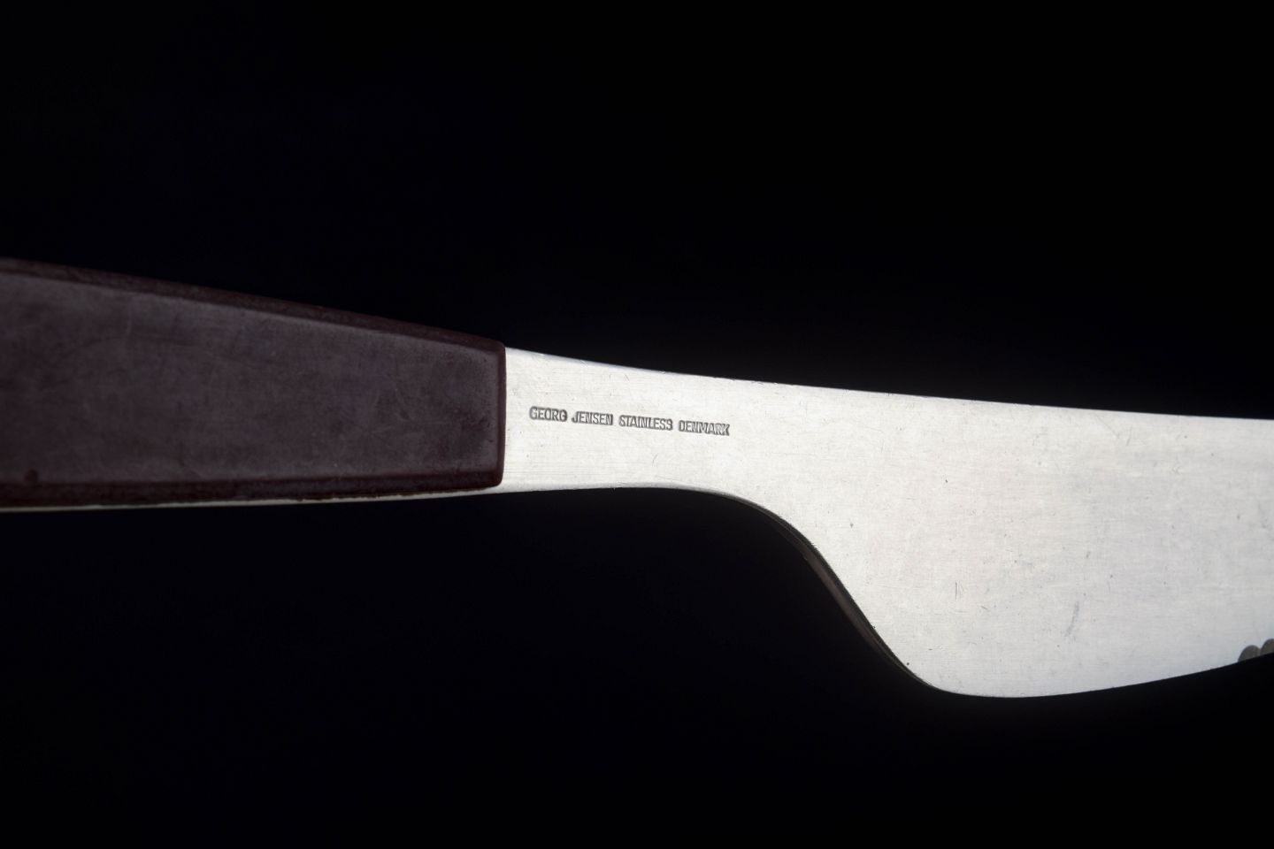 Henning Koppel for Georg Jensen, Strata cutlery set for 3 persons.Set comprising three dinner knives, three dinner forks, and three table spoons in stainless steel with brown handles. The model is from the Strata series.