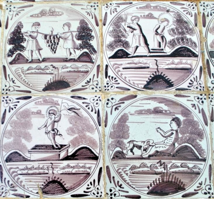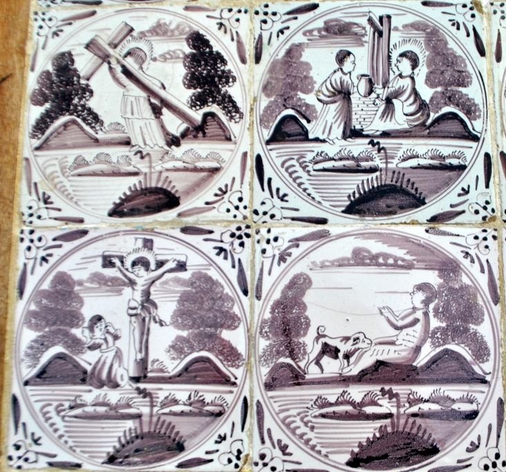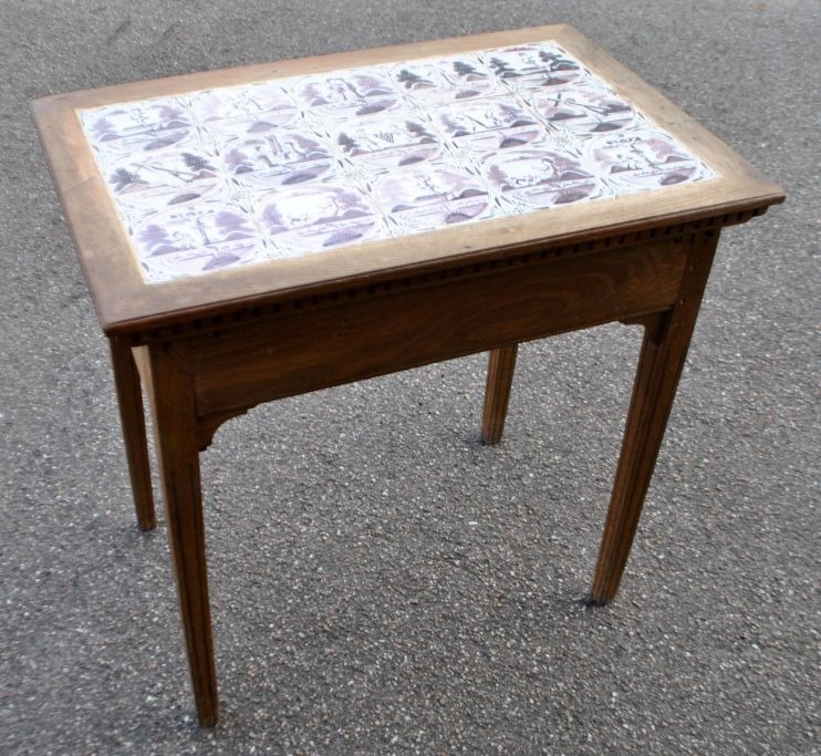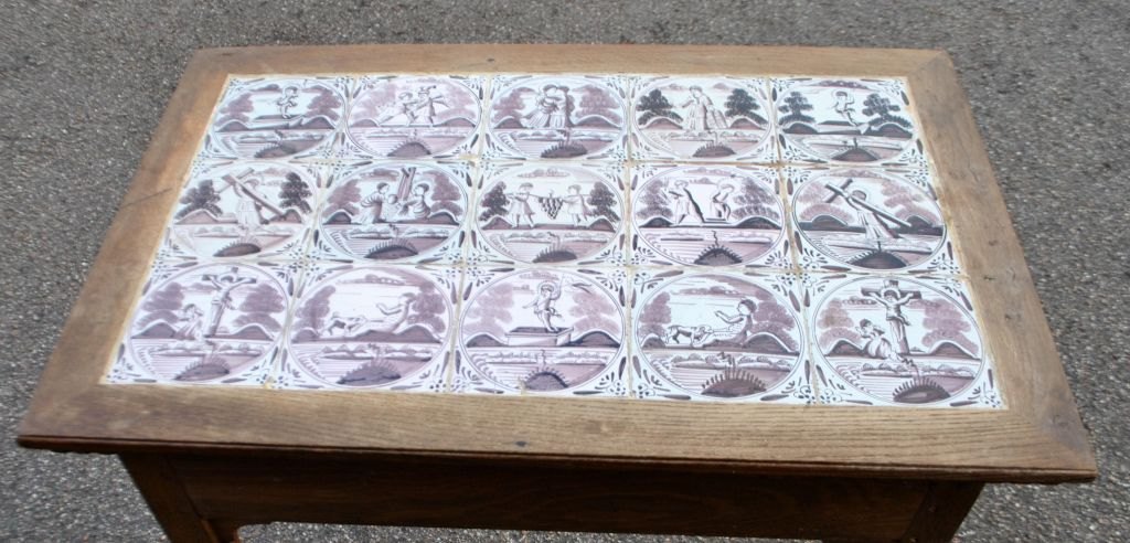 Original Danish tile table, Louis XVI, late 18th century. Oak with dentils and callouts on legs. Top in the form of 15 Dutch manganese-colored tiles from 1750 - 1775 with biblical motifs and ox-head corners. H.: 75 cm. L.: 76 cm. W.: 50 cm.Item number: 28800