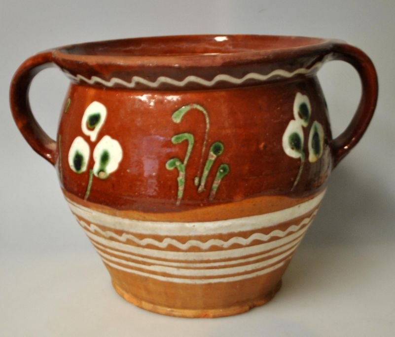 Two-handled jar with brown exterior coating, Sorring, ca. 1870, Denmark. Decorated with flowers. H.: 18 cm. Dia.: 20 cm.Item number: 28810