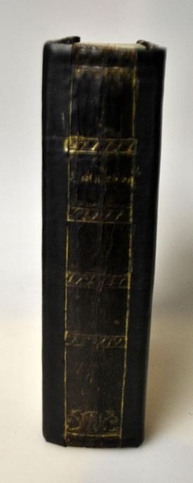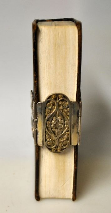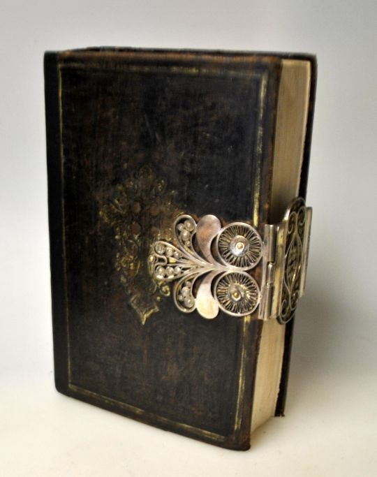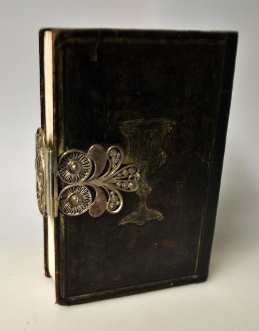 Psalm book in black leather binding and silver fittings, 1857. Denmark. Silver fittings with filigree. H.: 17 cm. Silver fittings with indistinct master mark.Inside with text: Belongs to Christian Pallesen, bought at auction on January 29, 1857.