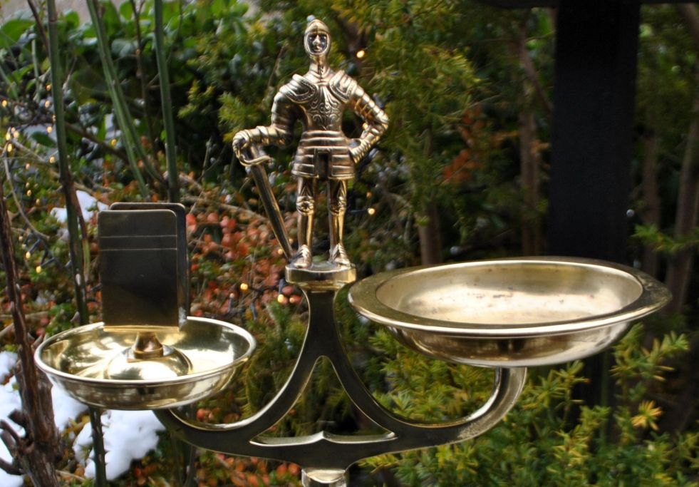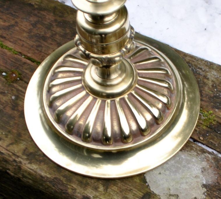 Brass stand with ashtray and match holder, 19th century. With double-twisted column and on top decorated with a knight in armor. On a round foot. H: 86 cm. W: 32 cm.Item number: 28931