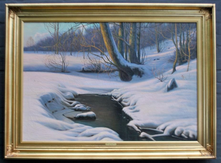 Wang, Albert (1864 - 1930) Denmark: Snow landscape. Oil on canvas. Signed: A. Wang. H: 67 cm. W: 95 cm.Framed: H: 82 cm. W: 113 cm.